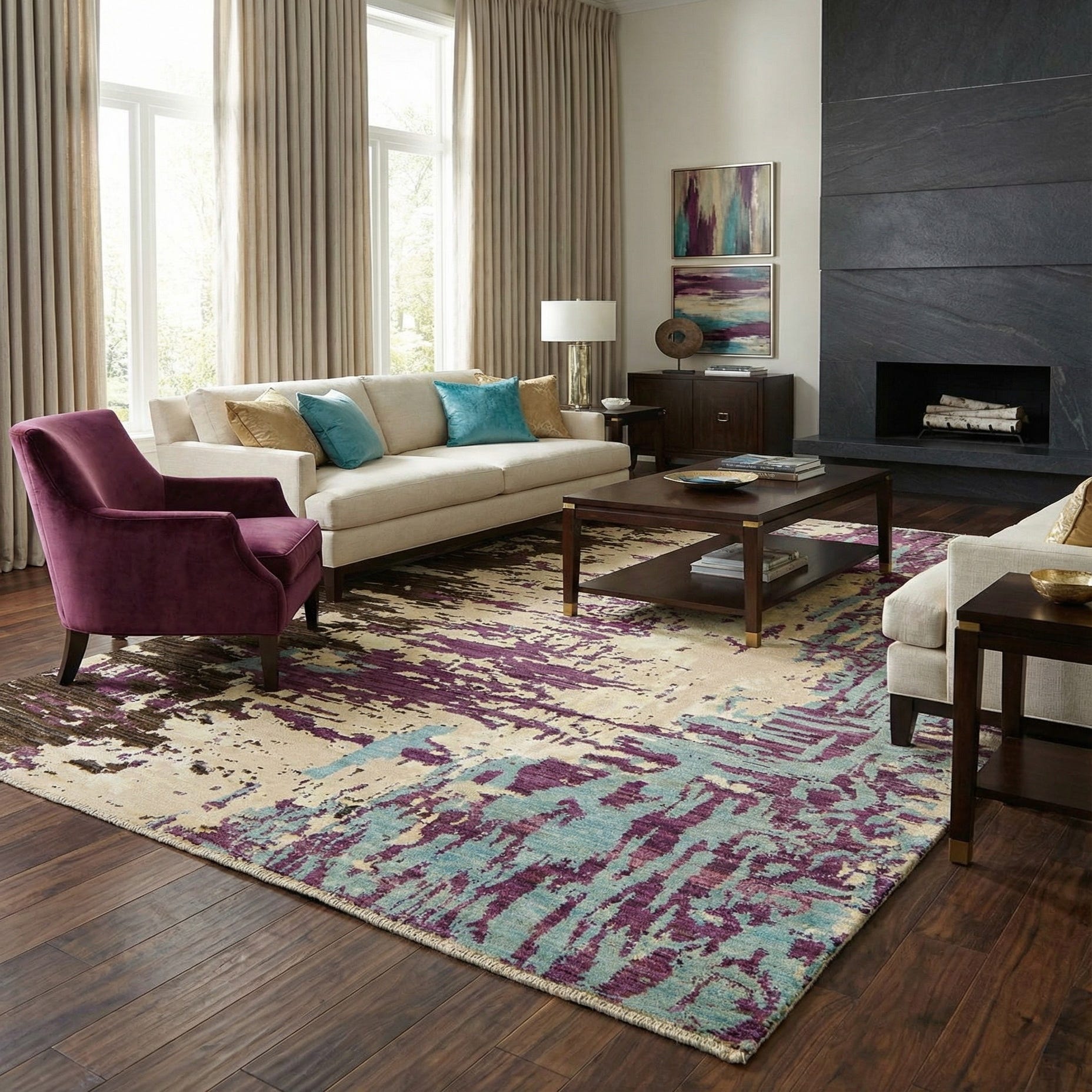 Primary color is Multi. Colors in this rug include: Multi, Beige, Turquoise, Yellow, Purple, Brown, Ivory, Light Blue, Light Brown.