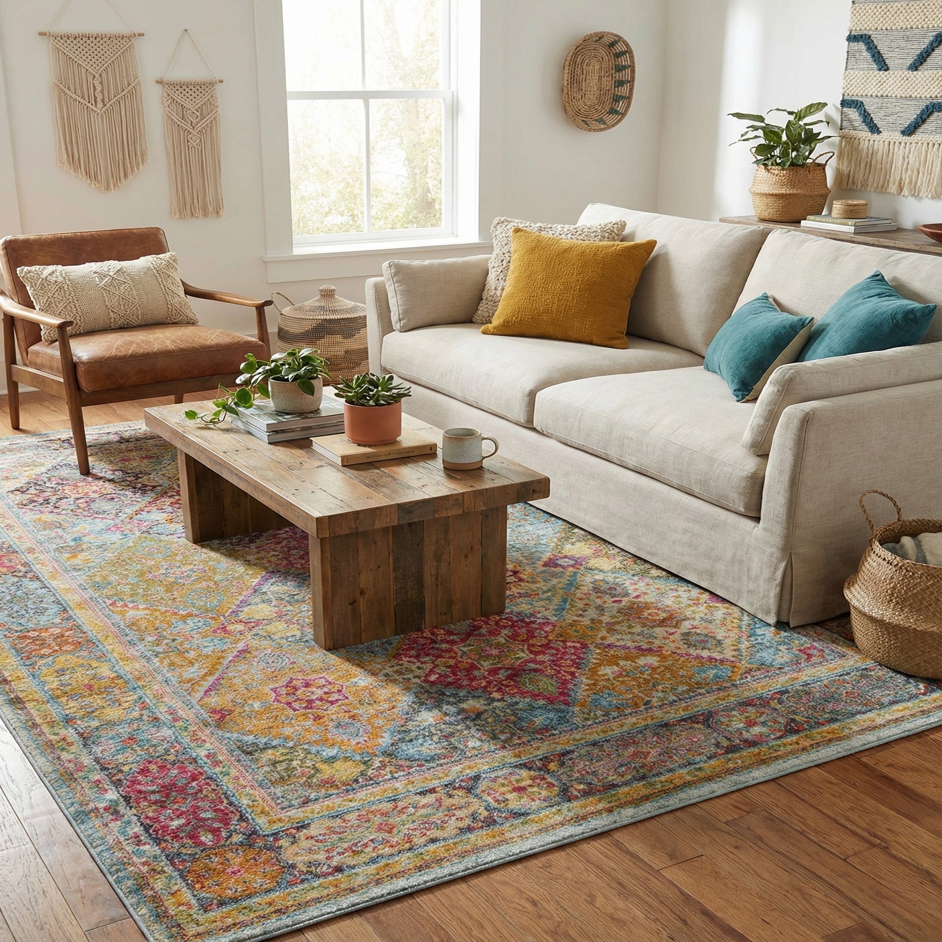 Primary color is Multi. Colors in this rug include: Multi, Blue, Burgundy, Gold, Olive, Red, Pink, Light Blue.