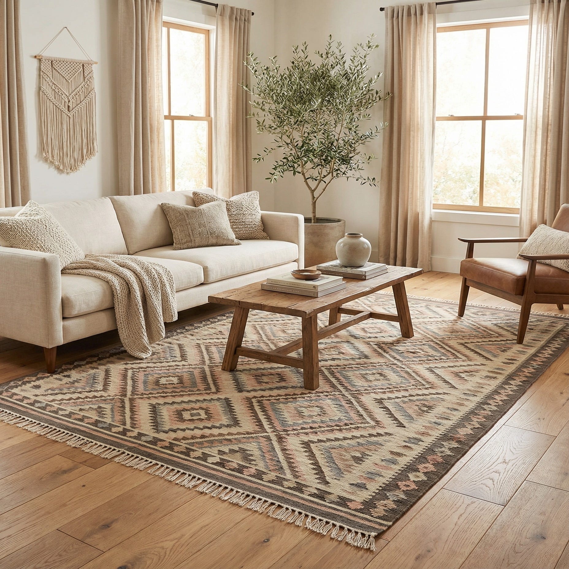 Primary color is Multi. Colors in this rug include: Multi, Beige, Brown, Gray, Light Brown, Pink.