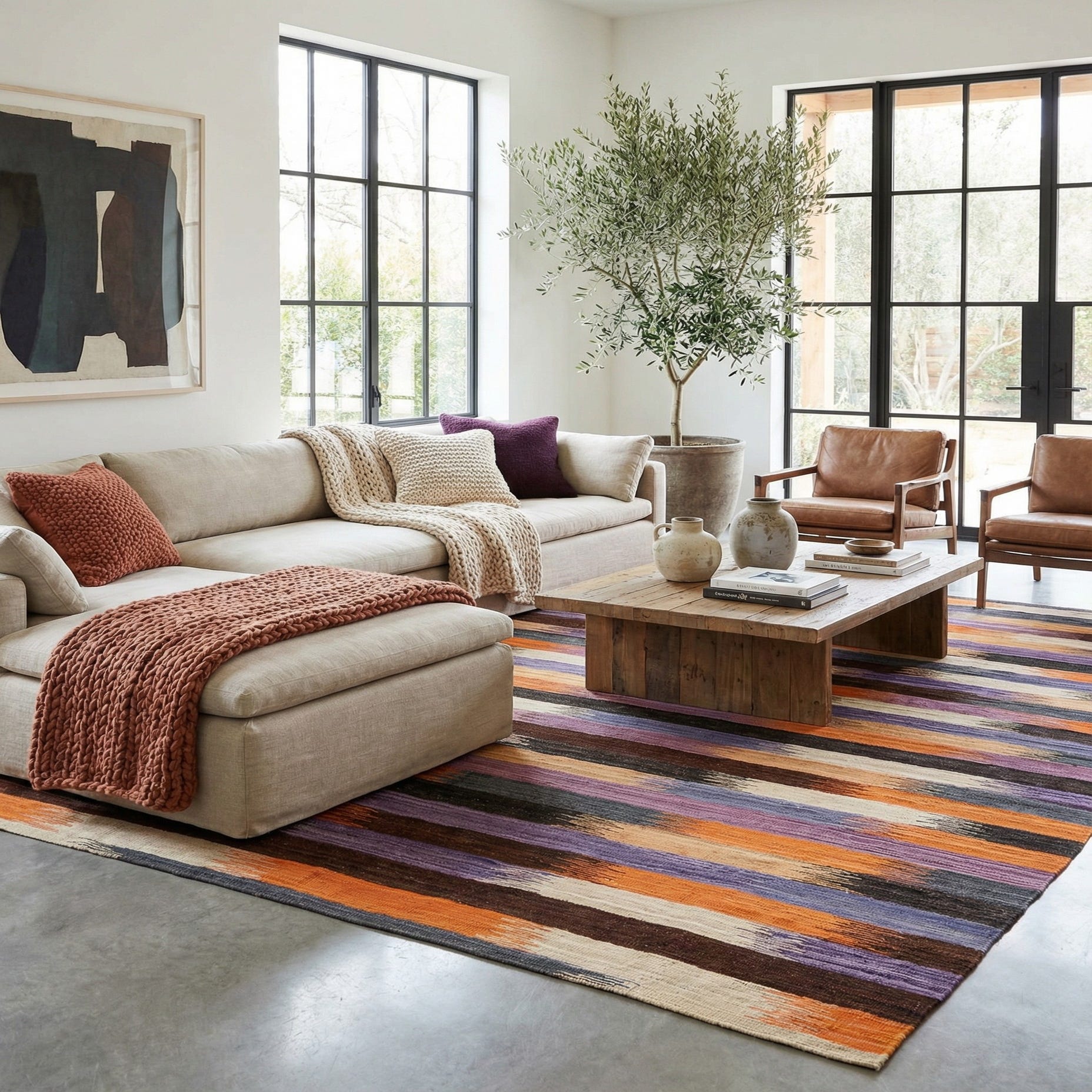 Primary color is Multi. Colors in this rug include: Multi, Beige, Black, Brown, Gray, Orange, Purple, Violet.