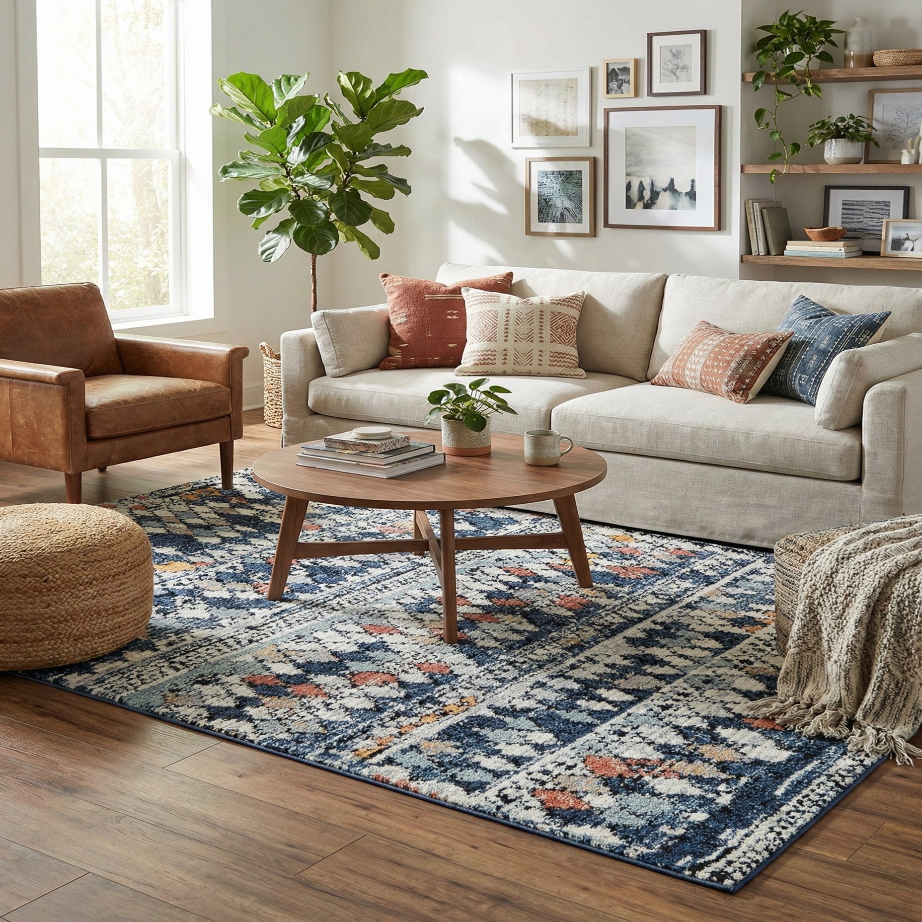 Primary color is Multi. Colors in this rug include: Multi, Black, Ivory, Navy Blue, Rust Red, Yellow.