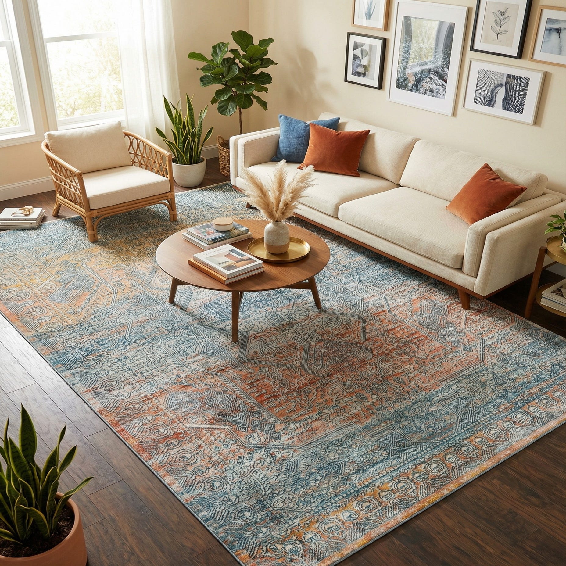 Primary color is Multi. Colors in this rug include: Multi, Ivory, Light Blue, Light Salmon, Rust Red, Terracotta.