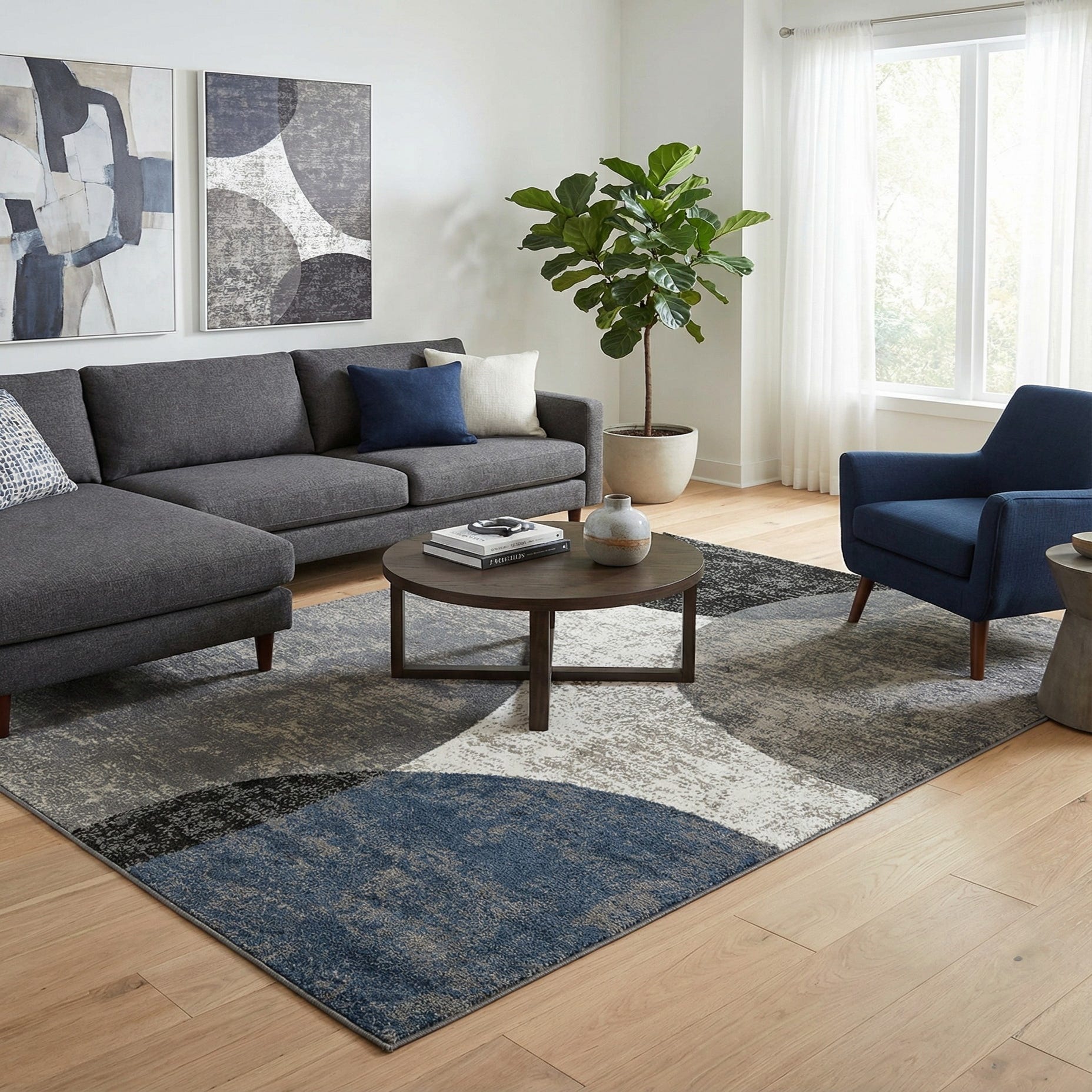 Primary color is Multi. Colors in this rug include: Multi, Black, Ivory, Gray, Blue.
