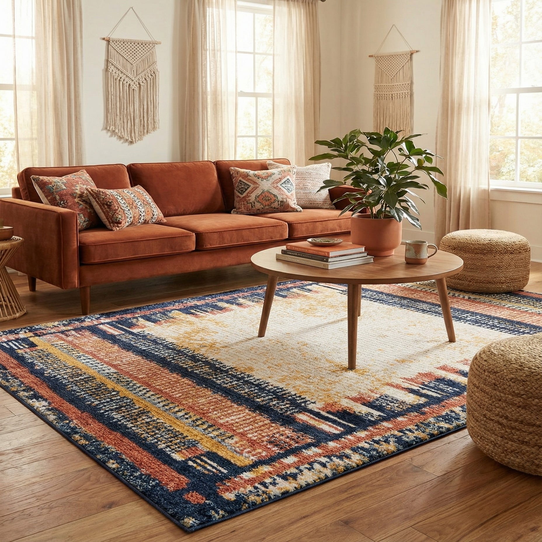 Primary color is Multi. Colors in this rug include: Multi, Black, Blue, Gray, Ivory, Light Blue, Navy Blue, Rust Red, Orange.