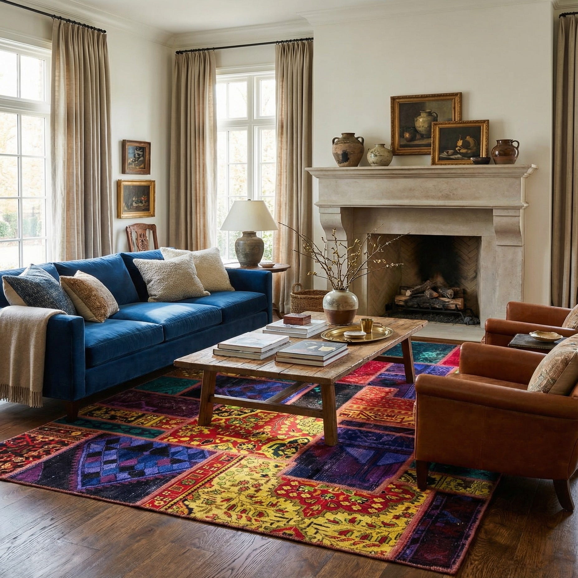 Primary color is Multi. Colors in this rug include: Multi, Blue, Green, Navy Blue, Orange, Peach, Red, Yellow, Violet, Purple.