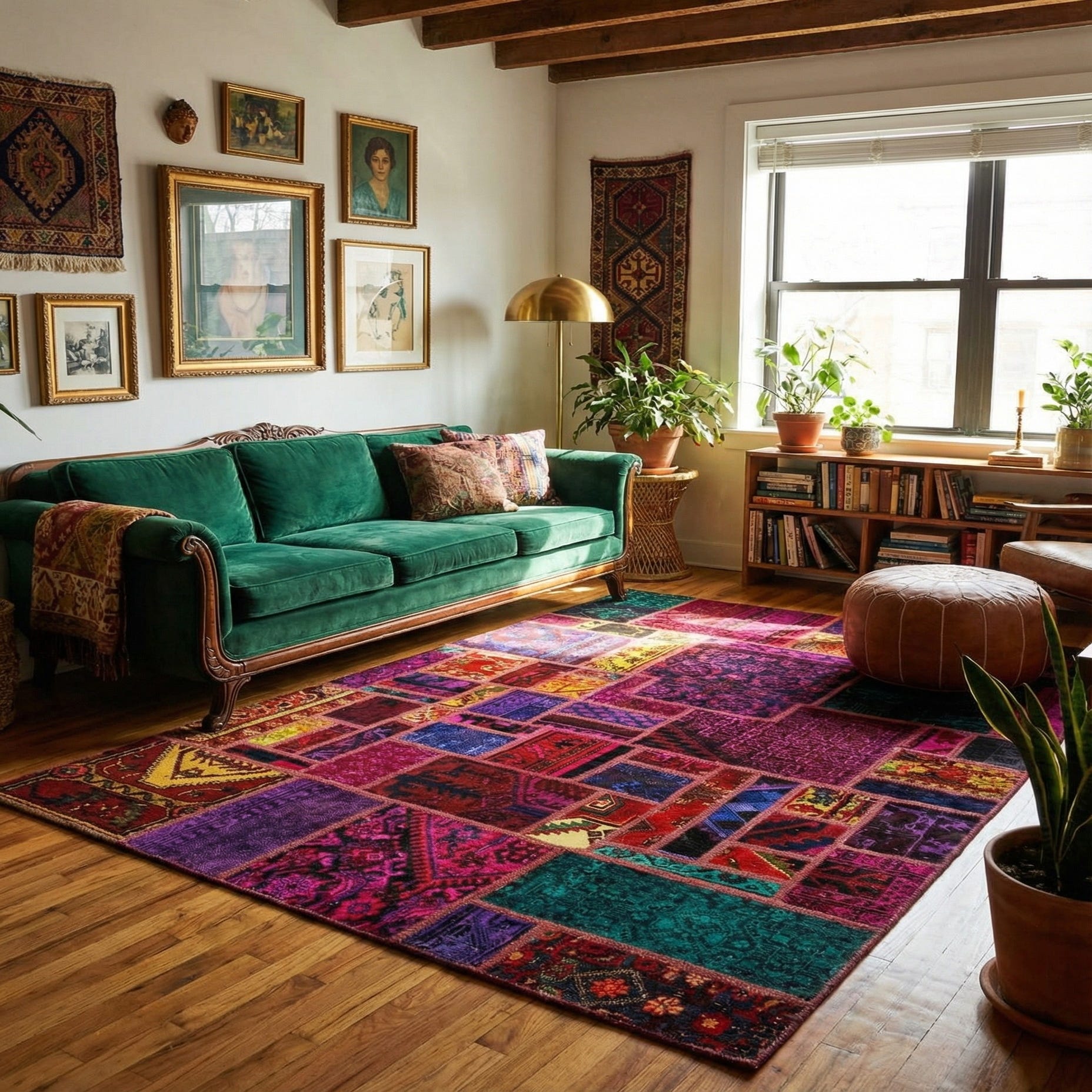Primary color is Multi. Colors in this rug include: Multi, Black, Cream, Green, Navy Blue, Olive, Purple, Red, Violet, Pink.