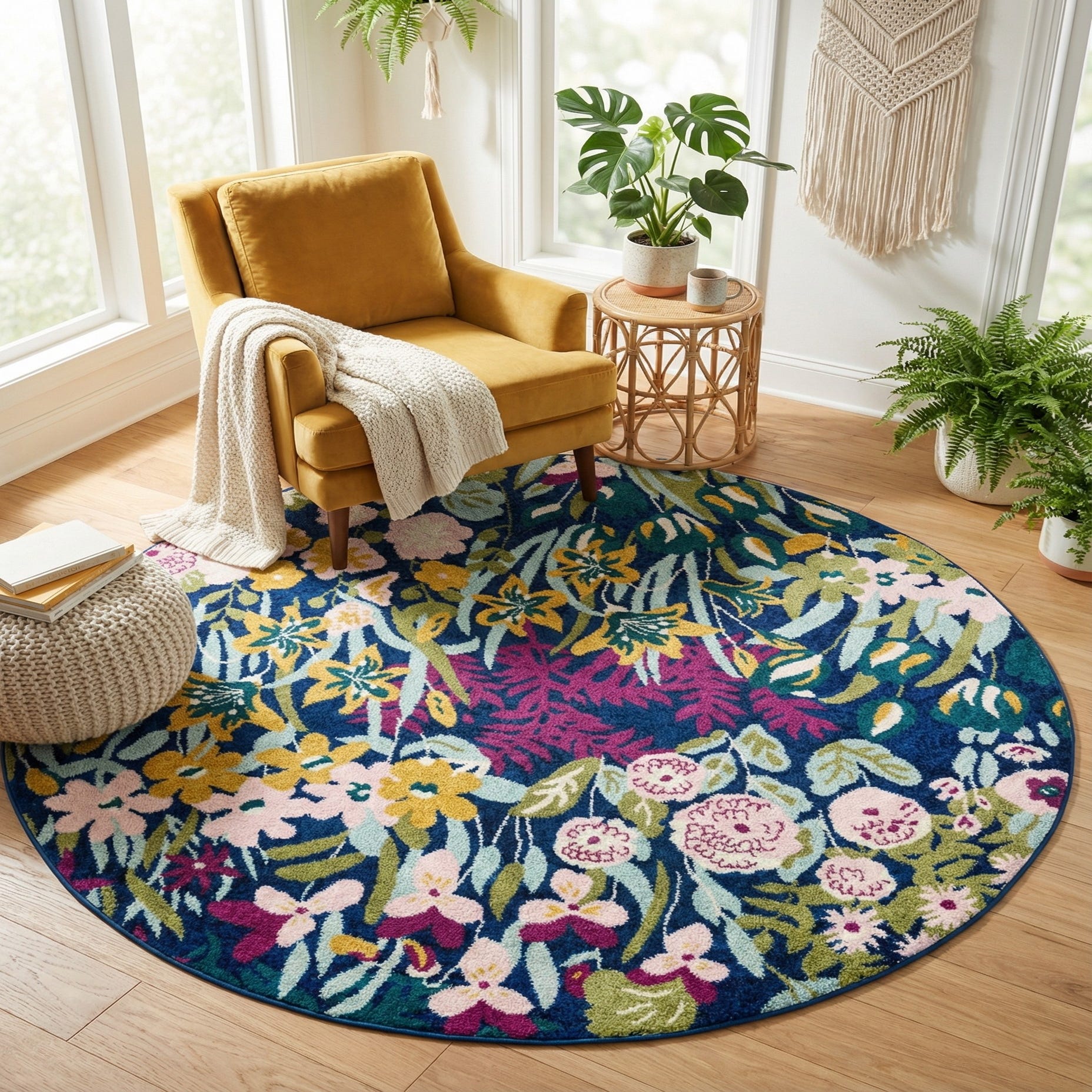 Primary color is Multi. Colors in this rug include: Multi, Green, Ivory, Light Blue, Navy Blue, Purple, Yellow, Pink, Teal.