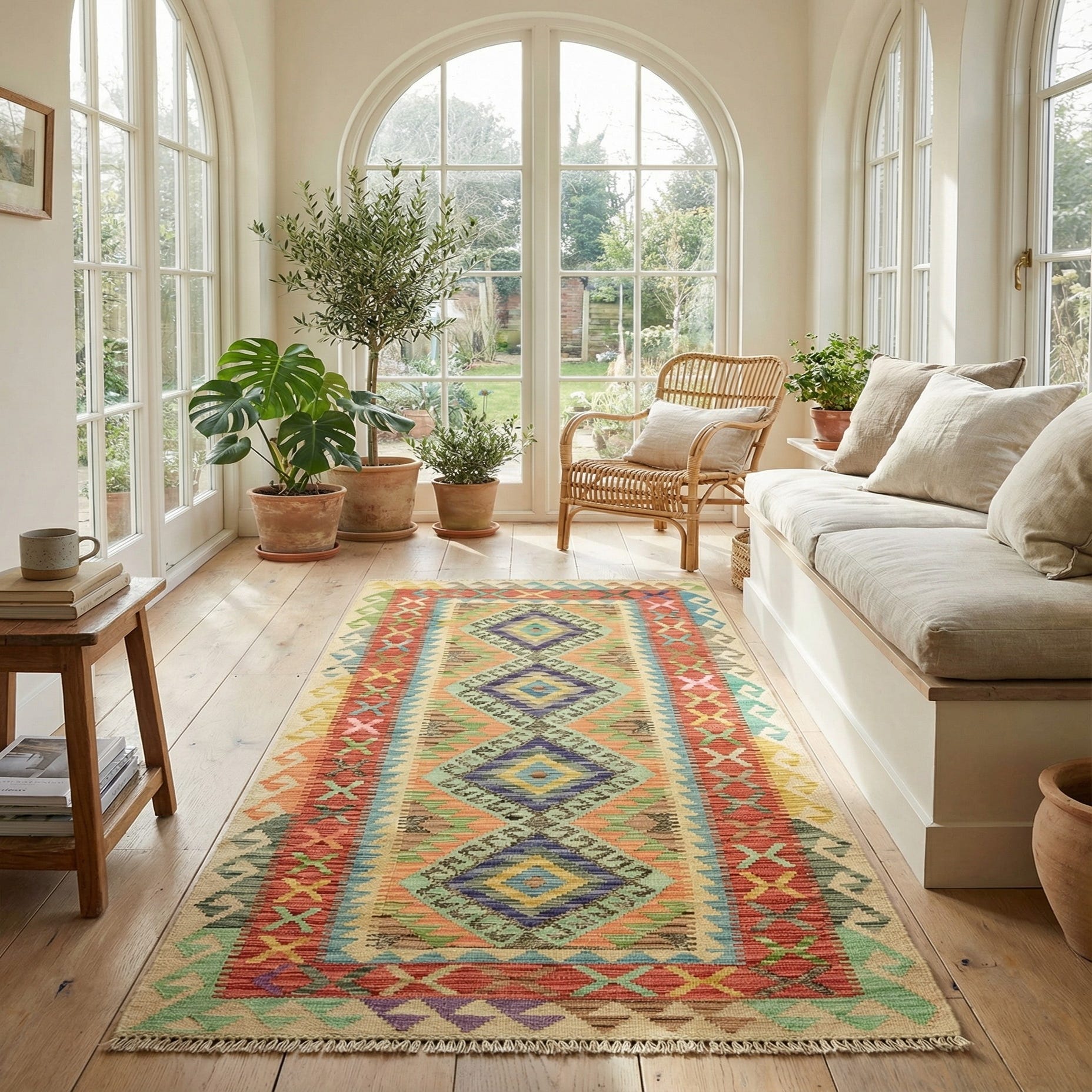 Primary color is Multi. Colors in this rug include: Multi, Beige, Blue, Brown, Green, Purple, Red, Yellow, Pink, Orange.