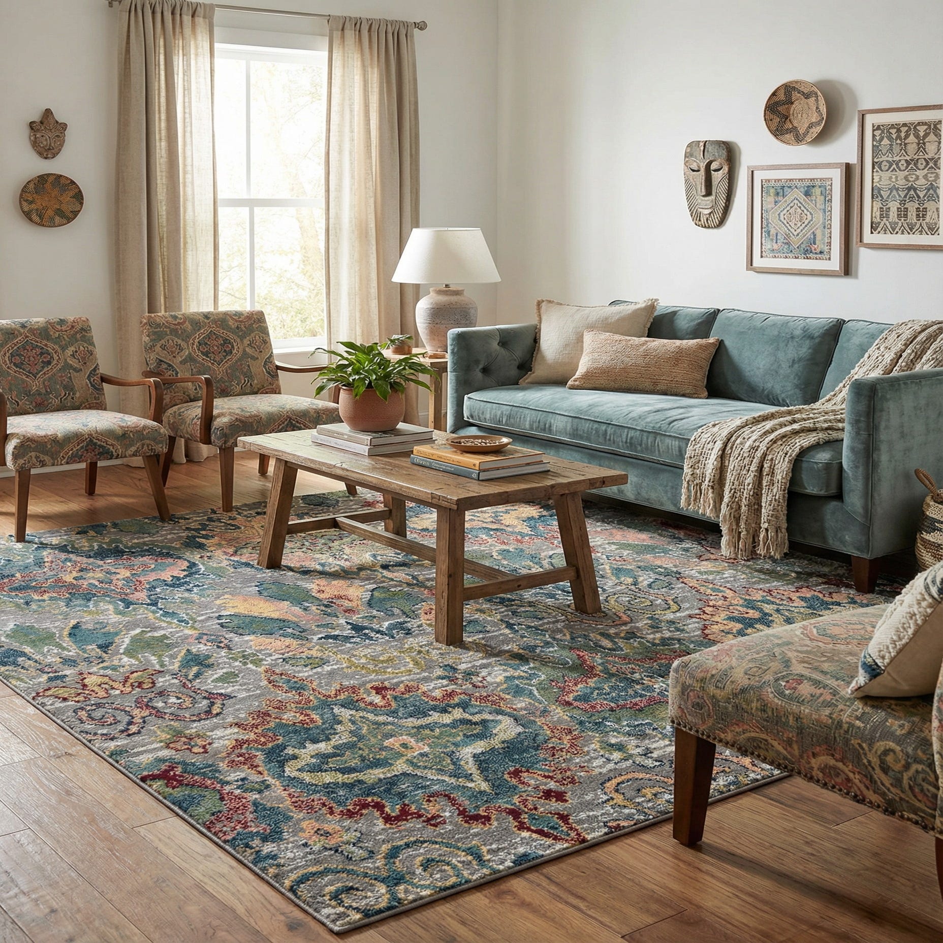 Primary color is Multi. Colors in this rug include: Multi, Blue, Burgundy, Gray, Green, Navy Blue, Pink.