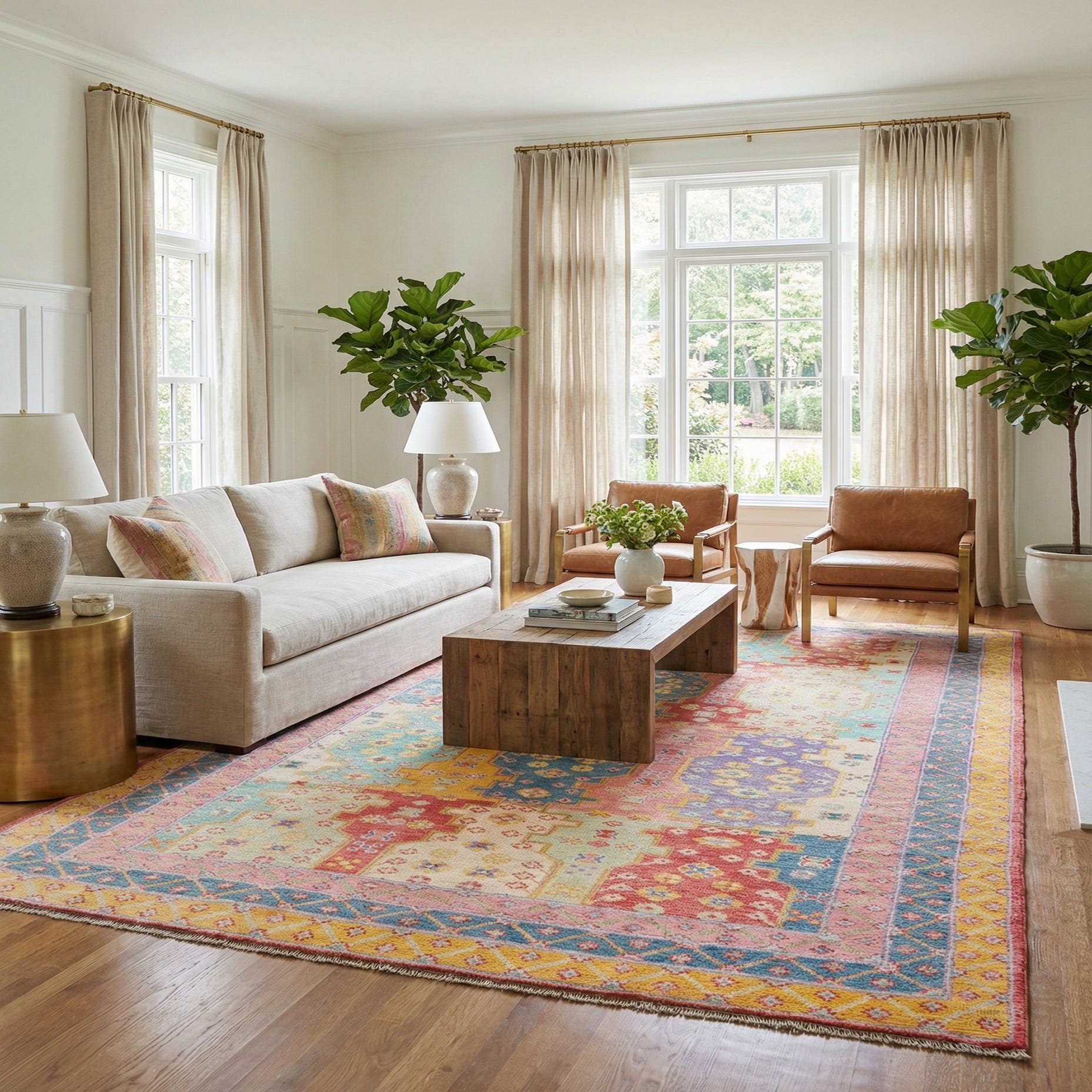 Primary color is Multi. Colors in this rug include: Multi, Beige, Blue, Ivory, Light Blue, Light Brown, Light Green, Light Salmon, Purple, Red, Teal, Turquoise, Yellow, Pink.