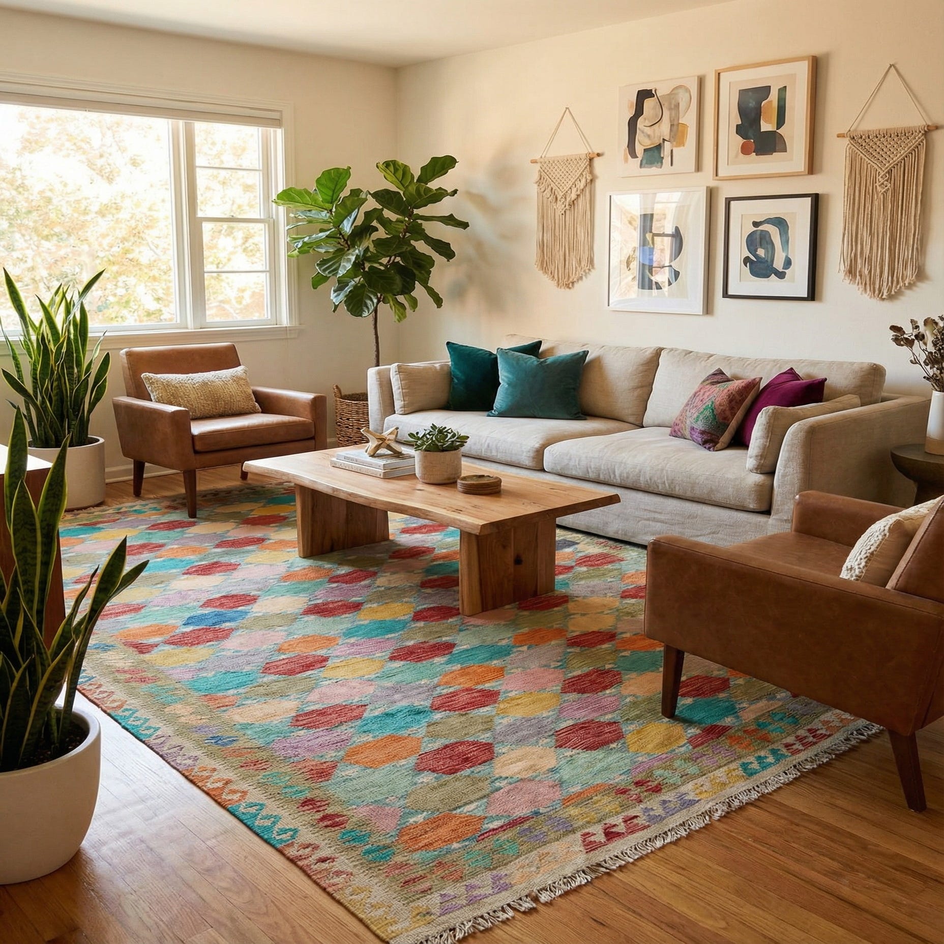 Primary color is Multi. Colors in this rug include: Multi, Beige, Blue, Green, Red, Yellow, Gray, Olive.