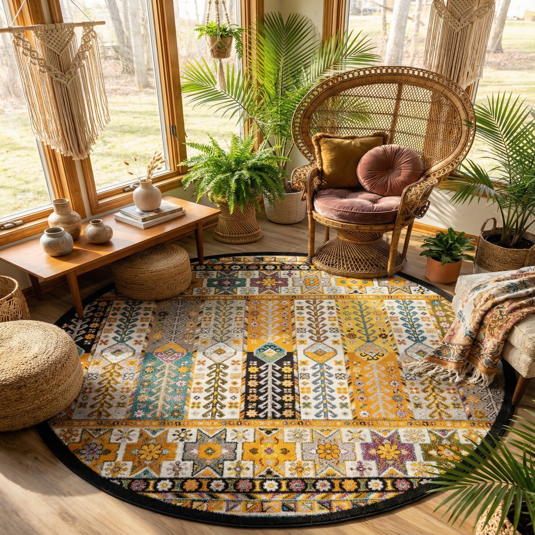 Primary color is Multi. Colors in this rug include: Multi, Blue, Brown, Gray, Green, Ivory, Navy Blue, Orange, Purple, Yellow.