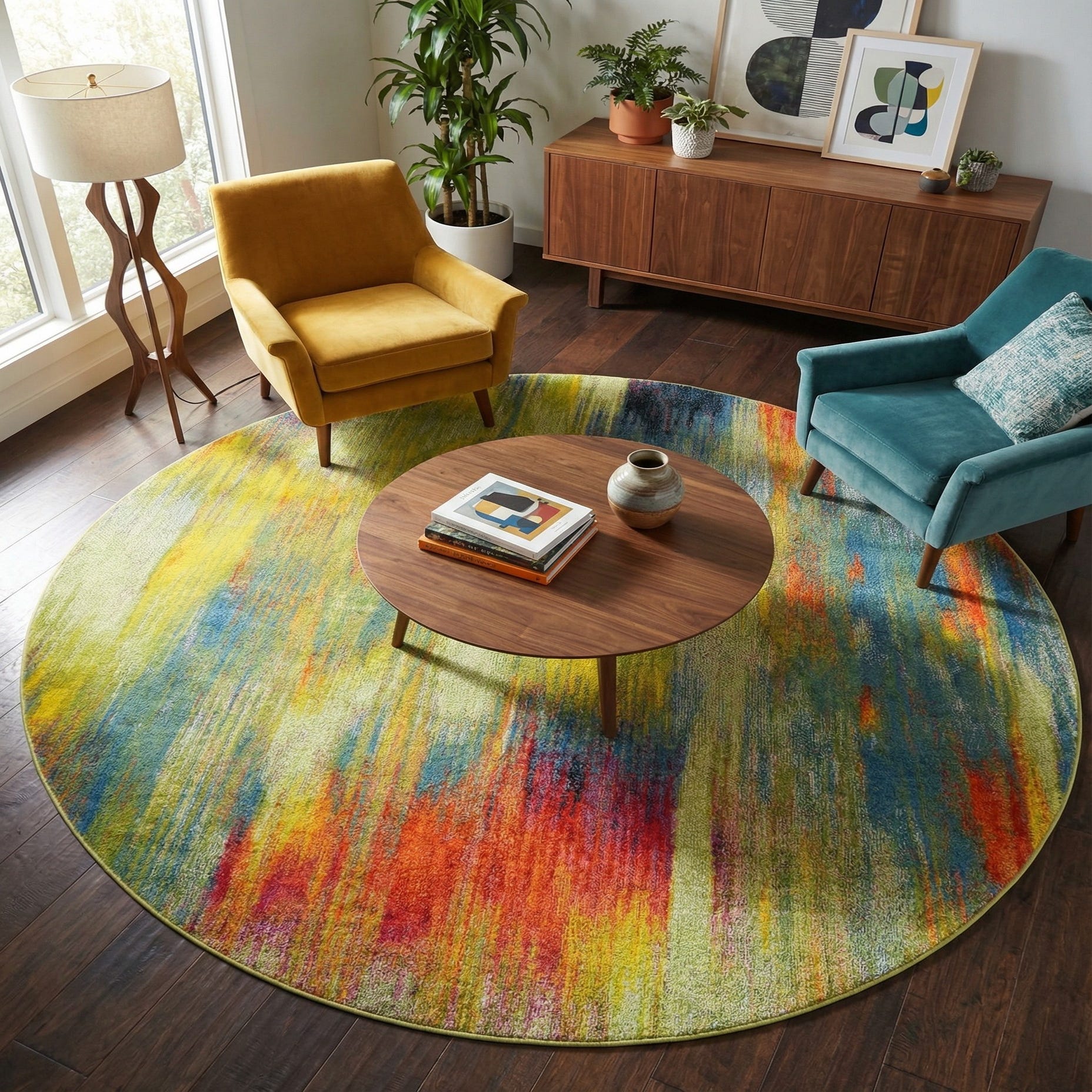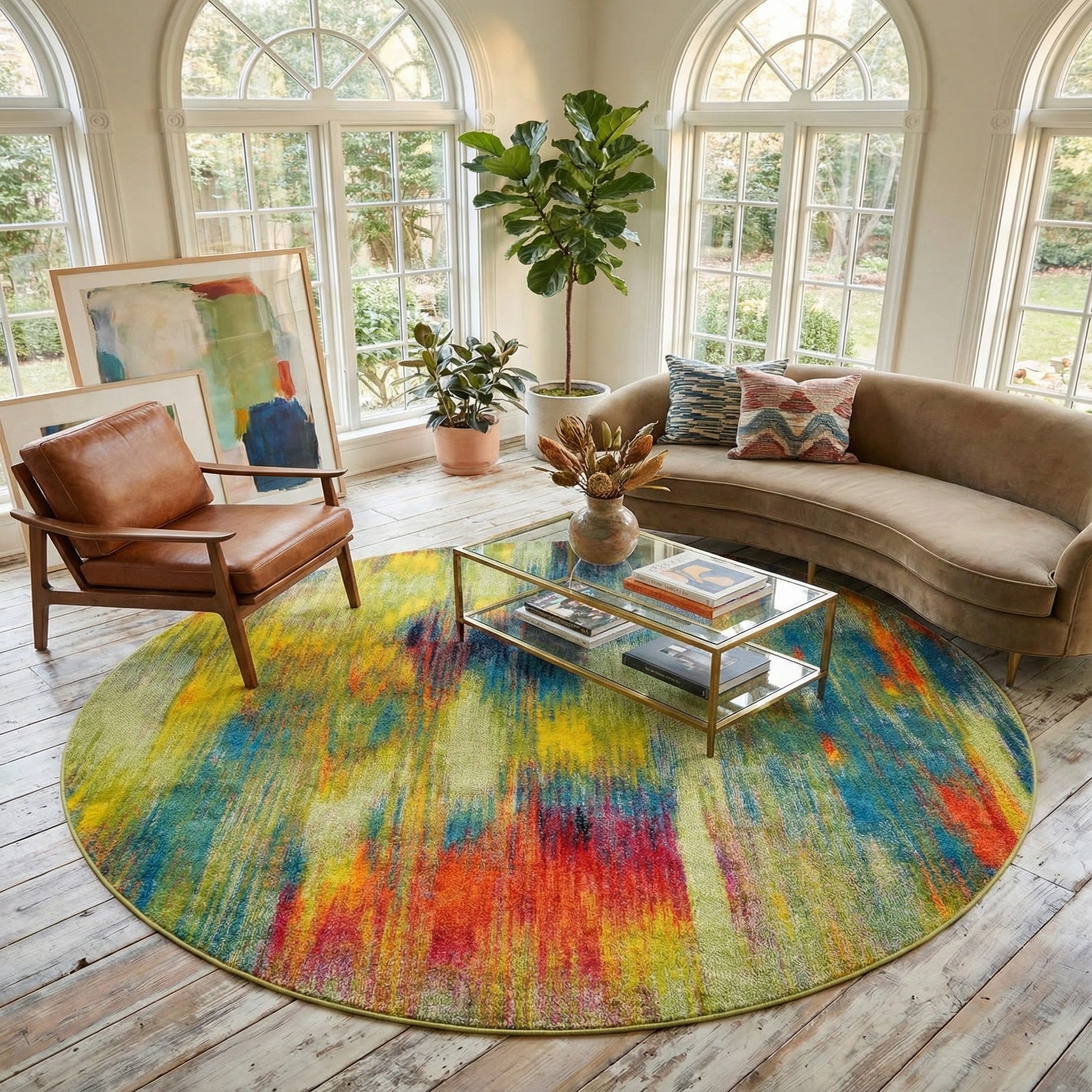Primary color is Multi. Colors in this rug include: Multi, Blue, Green, Navy Blue, Orange, Red, Yellow, Pink, Ivory.