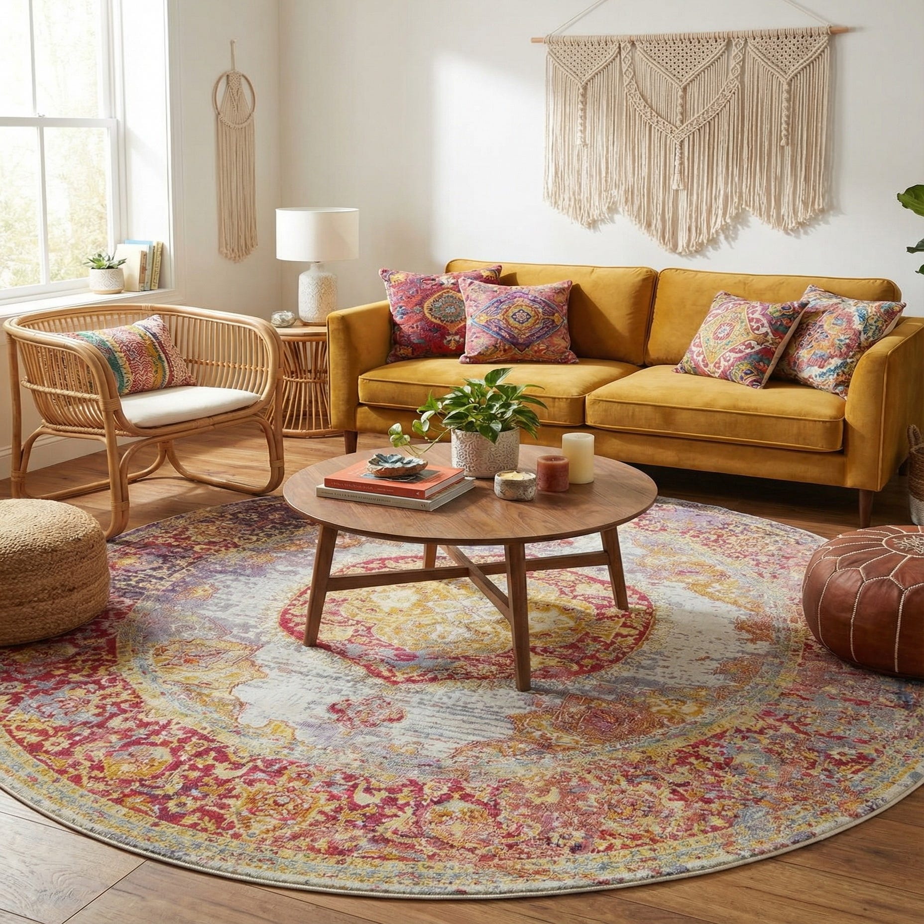 Primary color is Multi. Colors in this rug include: Multi, Gold, Olive, Yellow, Violet, Red.