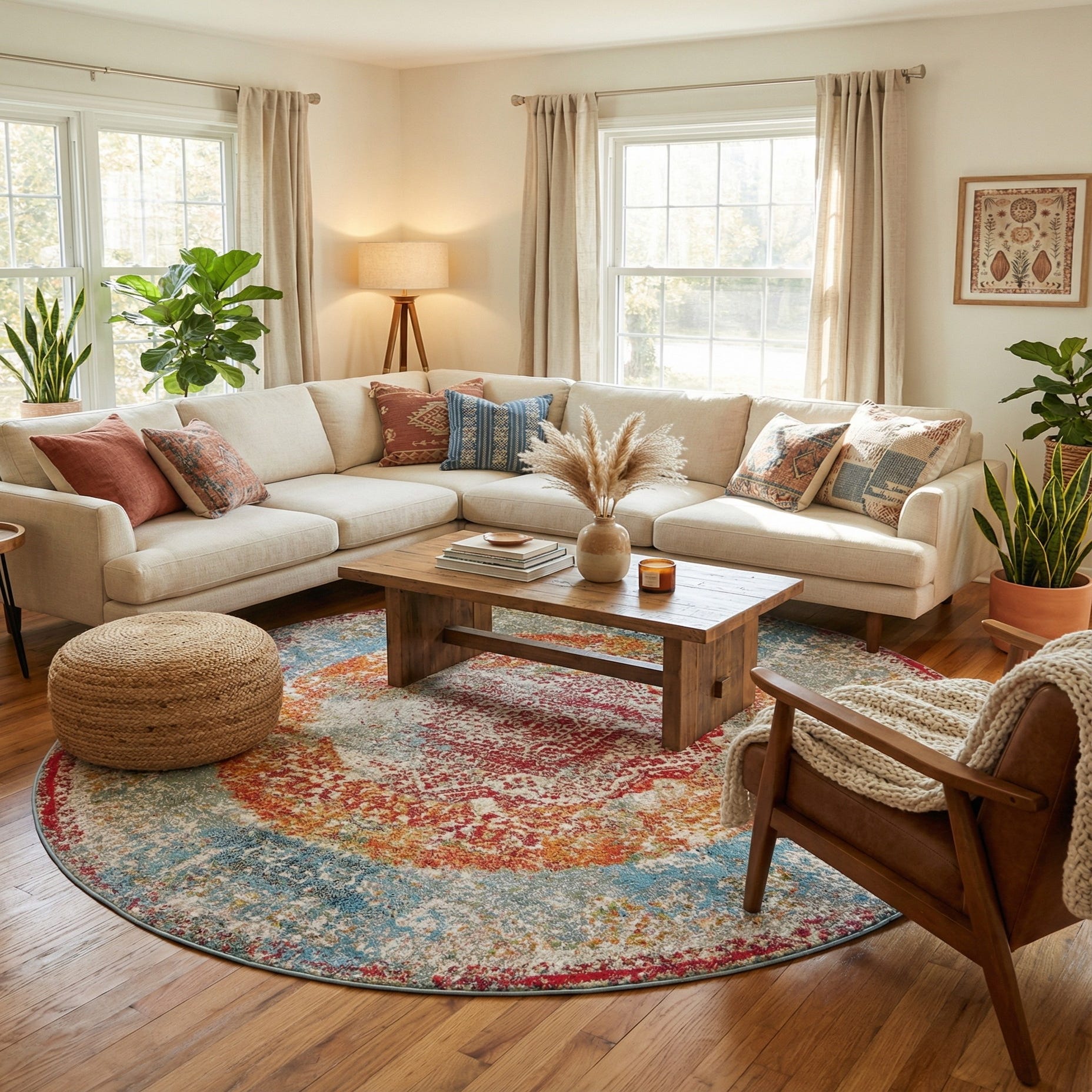 Primary color is Multi. Colors in this rug include: Multi, Gray, Ivory, Navy Blue, Orange, Red, Blue.