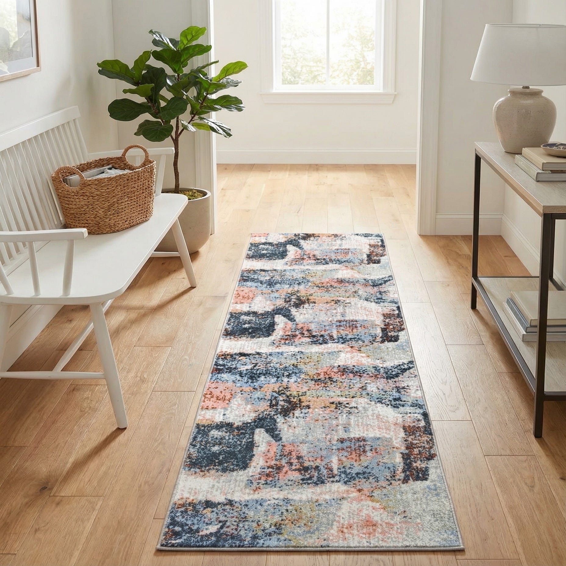 Primary color is Multi. Colors in this rug include: Multi, Blue, Gray, Ivory, Light Blue, Light Brown, Navy Blue, Peach, Rust Red, Pink.