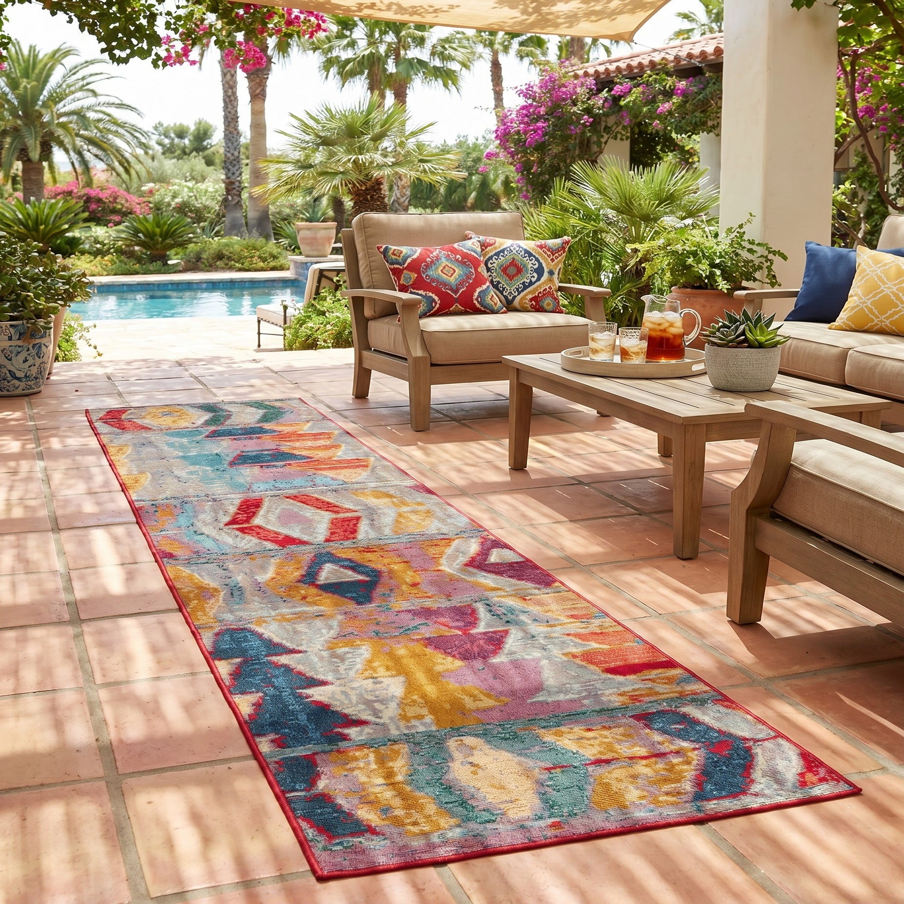 Fell in love with this rug when I saw it on-line for its delightful pattern and vivid colors. It arrived in two days from the day ordered about a week ago. We put it down on our renovated deck today...it is even more awesome than we thought it would be! The colors and pattern outset the colors of the deck perfectly.