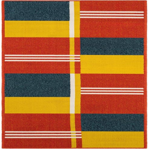 Primary color is Multi. Colors in this rug include: Multi, Navy Blue, Orange, Yellow, Ivory.