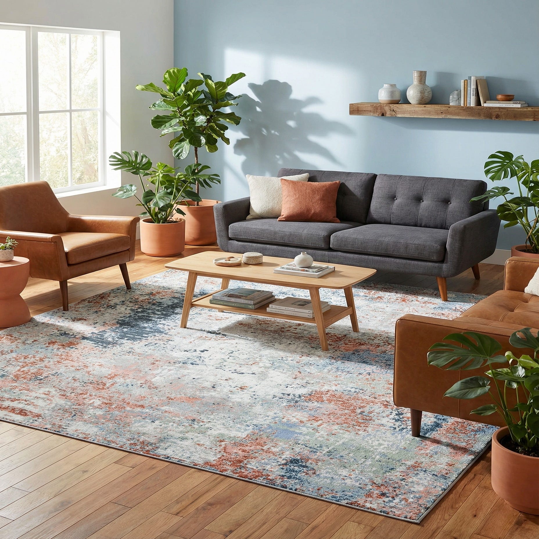 Primary color is Multi. Colors in this rug include: Multi, Blue, Gray, Light Blue, Navy Blue, Rust Red, Pink.