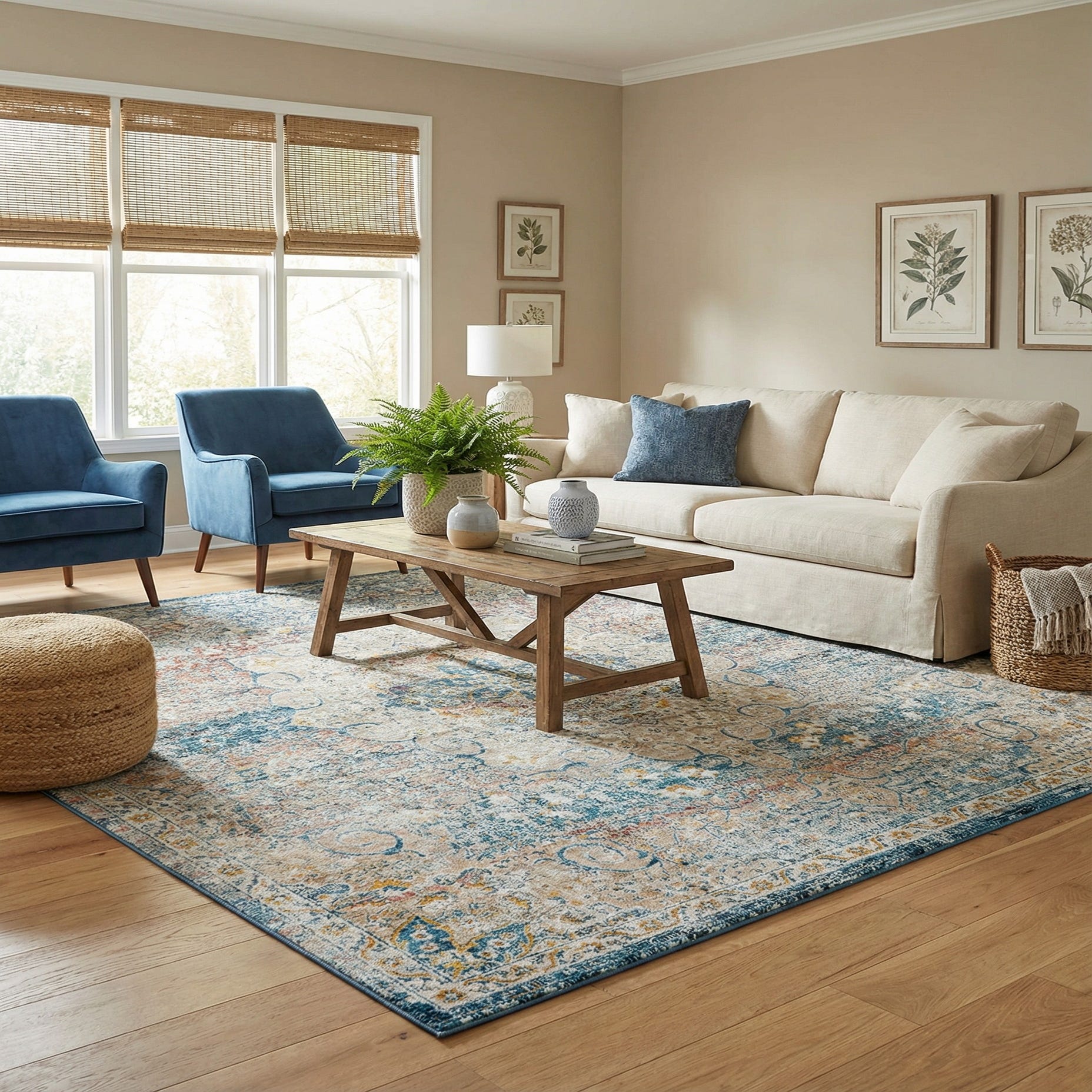 Primary color is Multi. Colors in this rug include: Multi, Blue, Gray, Ivory, Light Blue, Light Brown, Rust Red, Terracotta.