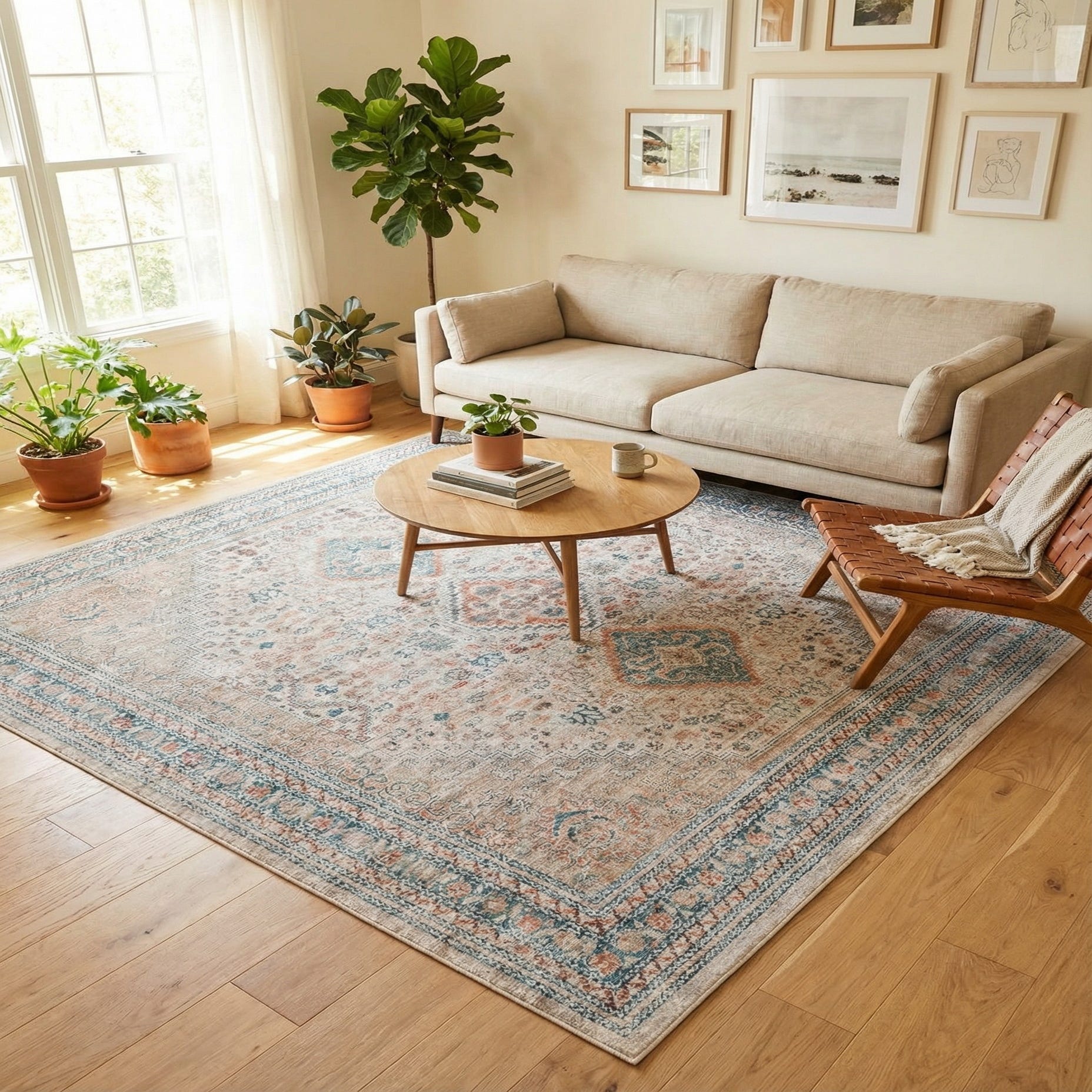 Primary color is Multi. Colors in this rug include: Multi, Blue, Light Blue, Light Brown, Rust Red, Terracotta.