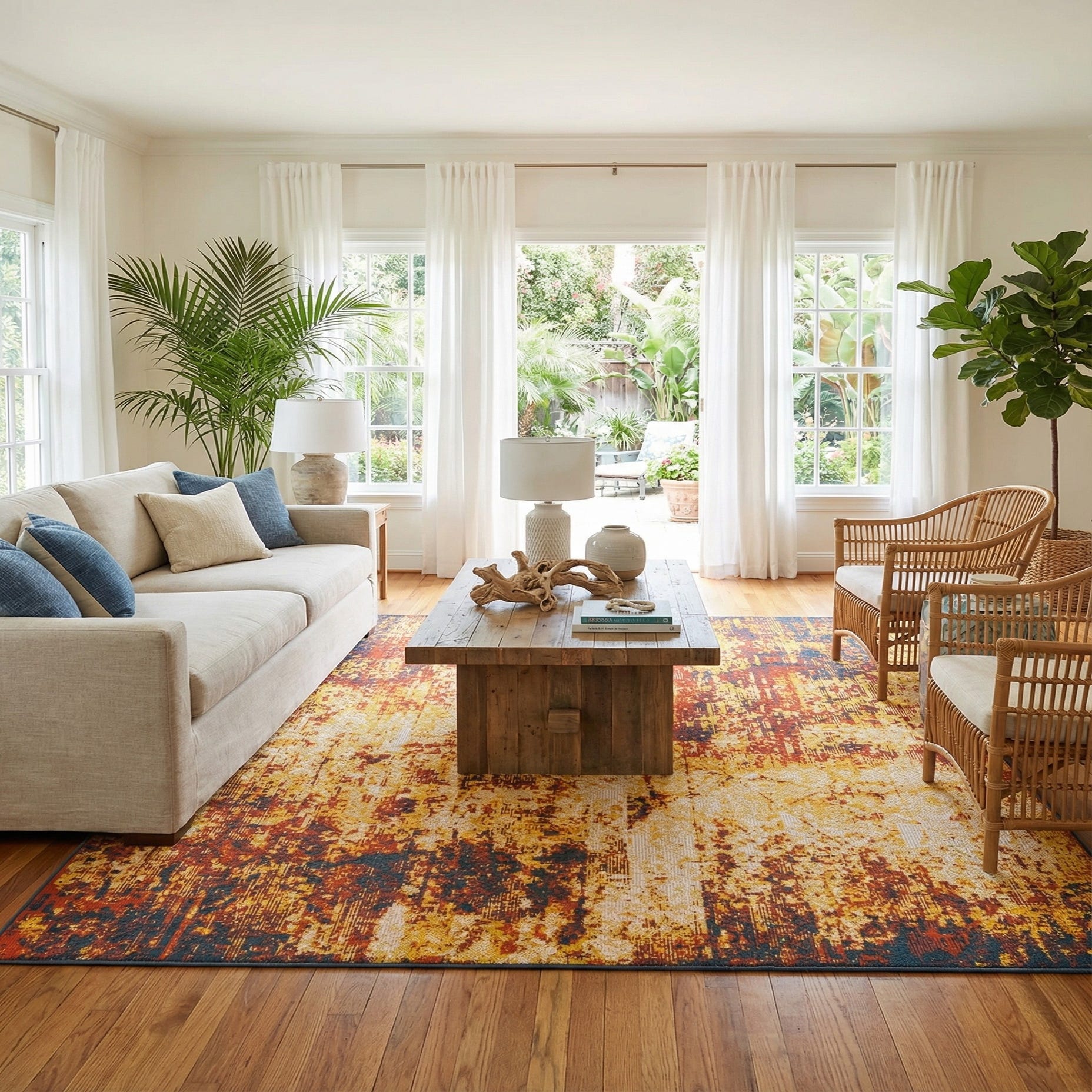 Primary color is Multi. Colors in this rug include: Multi, Orange, Yellow, Navy Blue, Ivory.