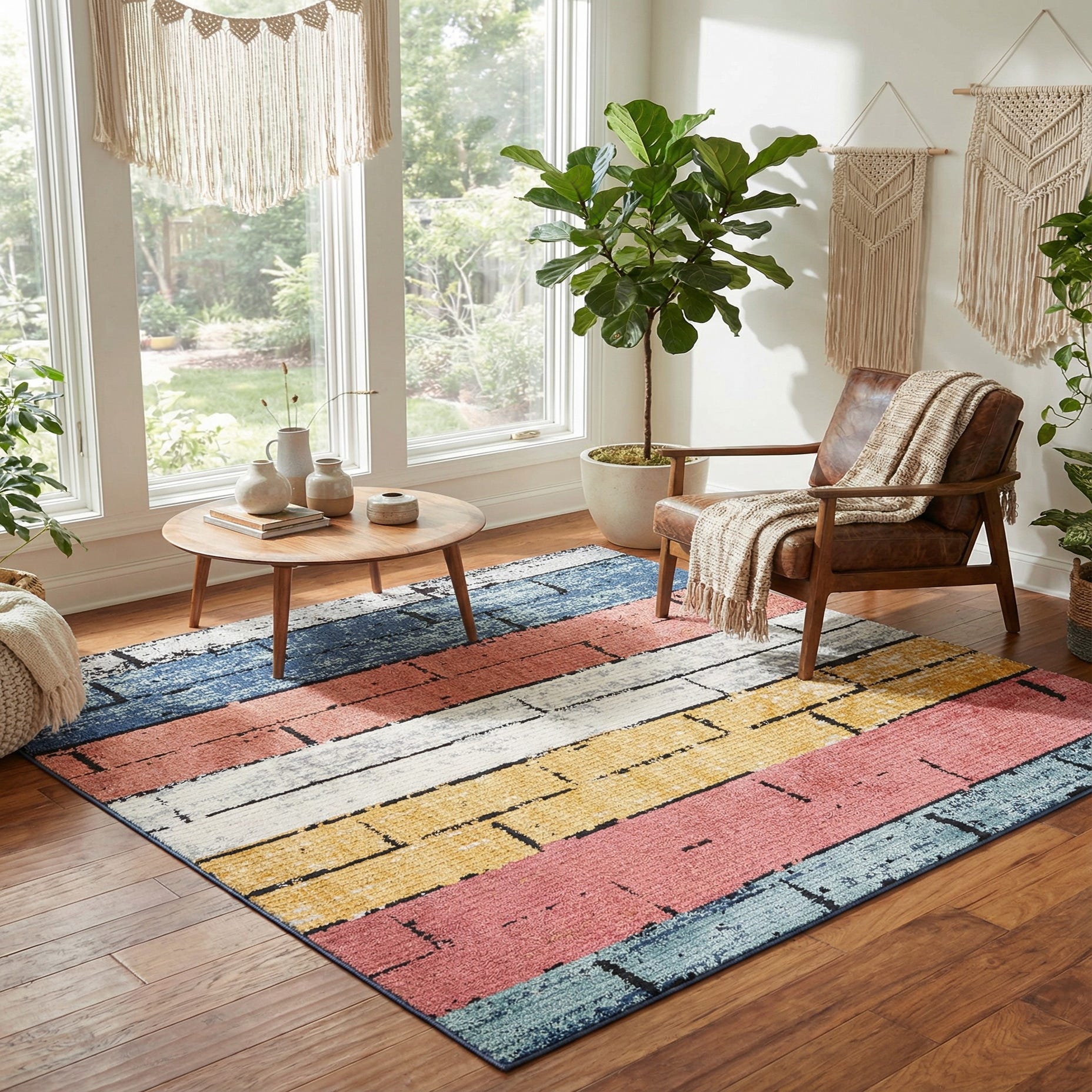 Primary color is Multi. Colors in this rug include: Multi, Black, Ivory, Gray, Light Blue, Peach, Yellow, Pink, Navy Blue.