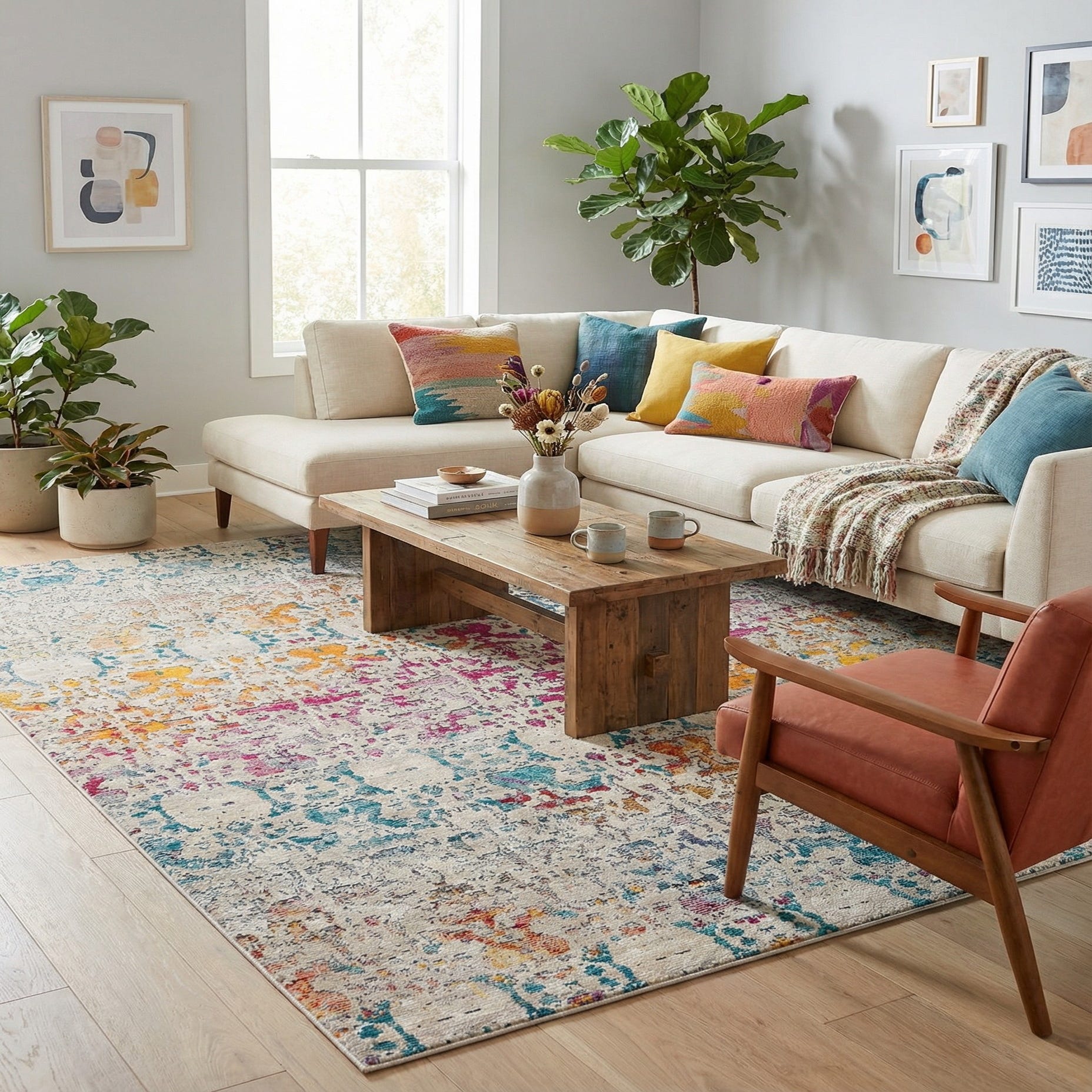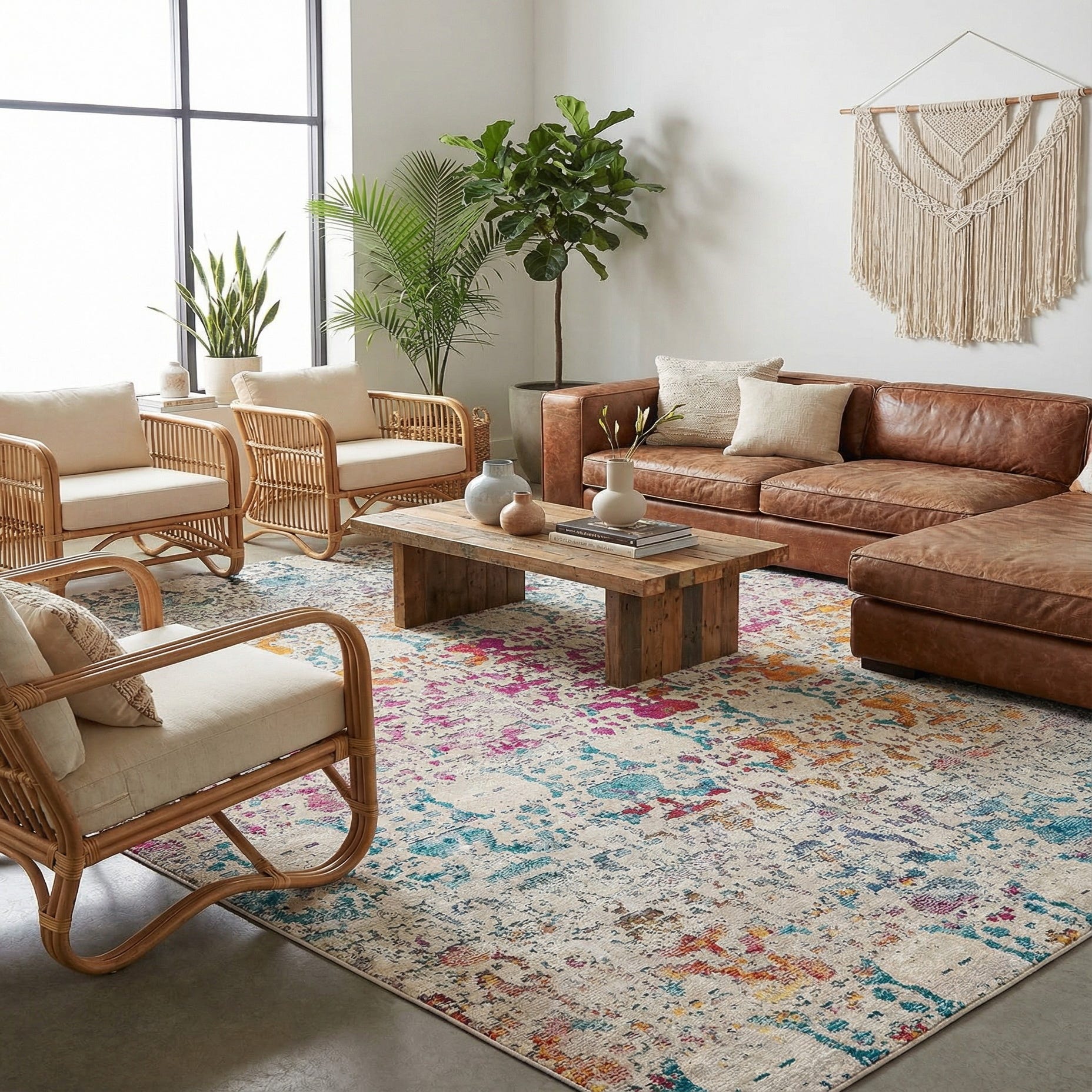 Primary color is Multi. Colors in this rug include: Multi, Beige, Blue, Gray, Ivory, Orange, Purple, Red, Turquoise, Yellow, Black.