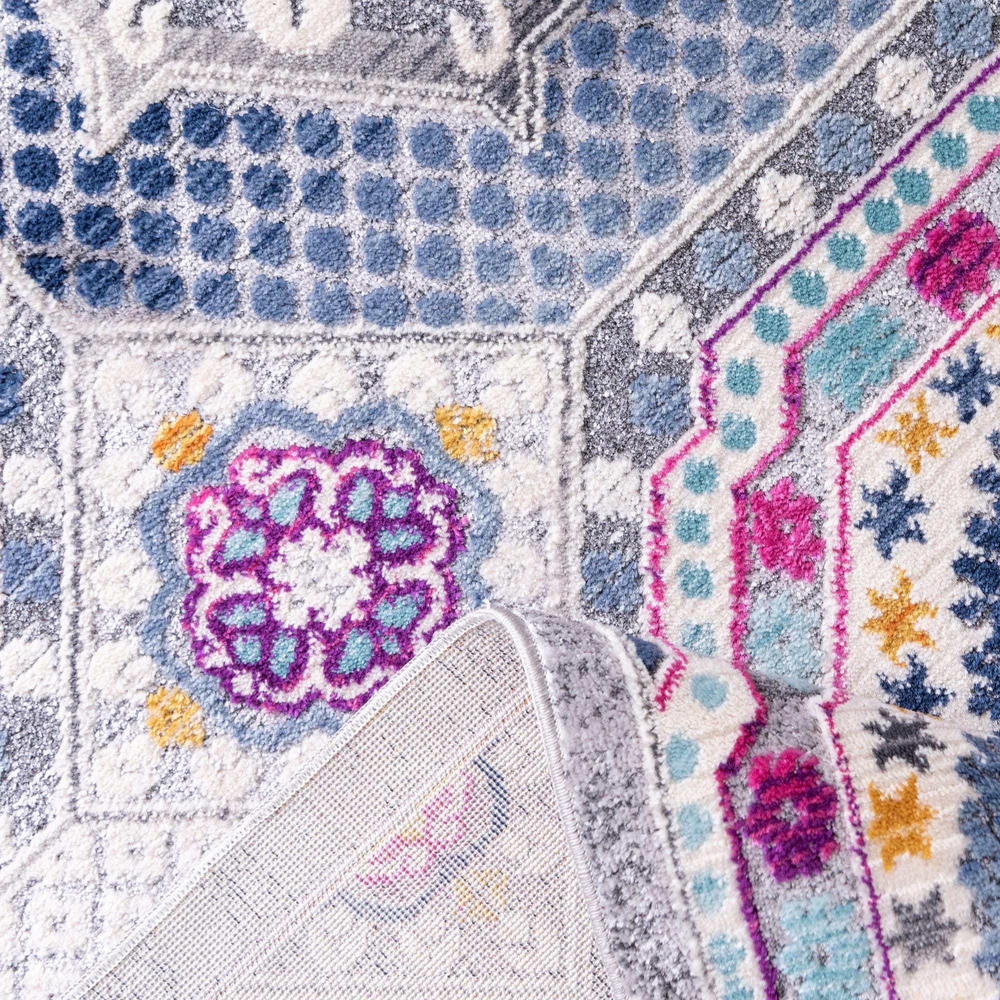Primary color is Multi. Colors in this rug include: Multi, Blue, Gray, Ivory, Navy Blue, Teal, Terracotta, Puce.