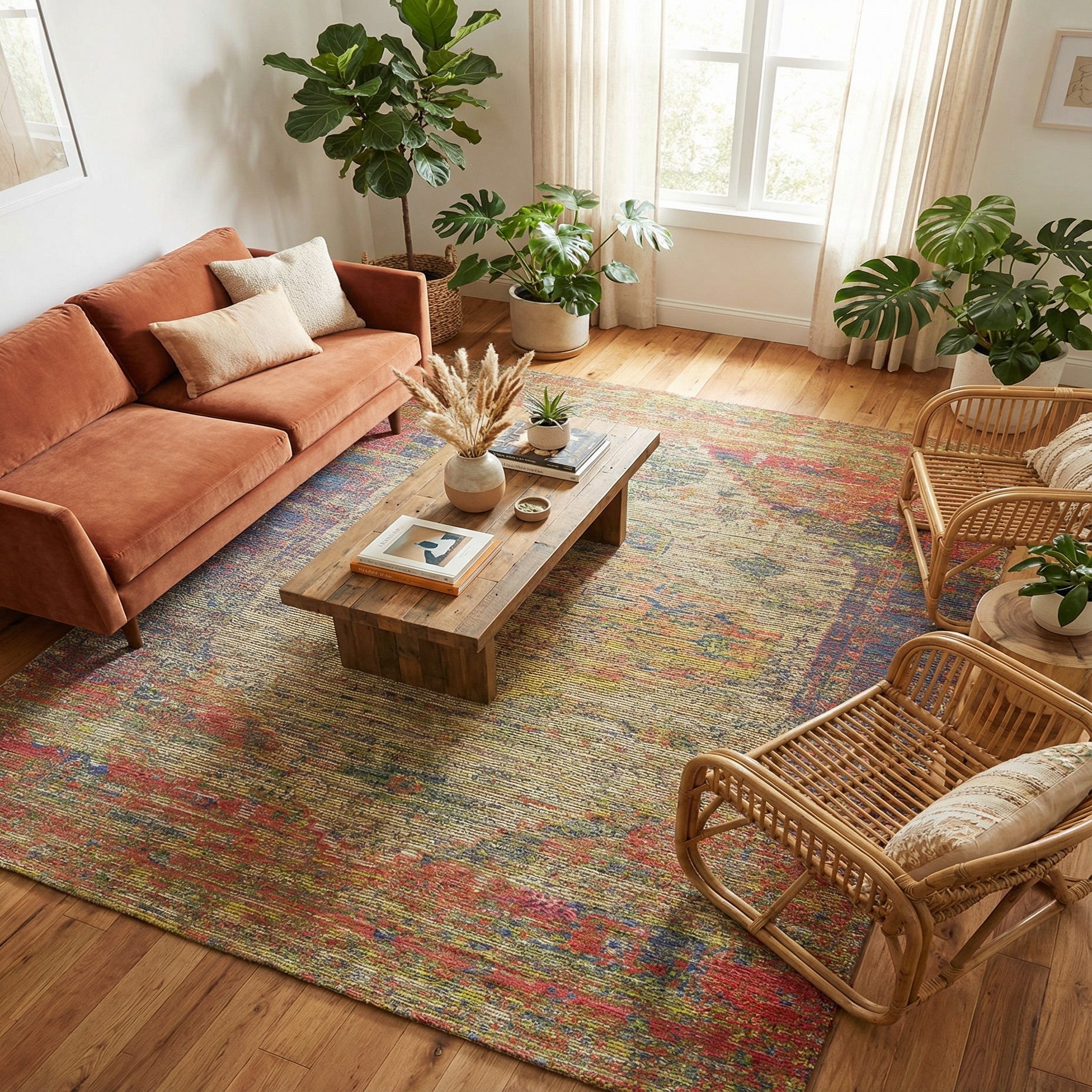 Primary color is Multi. Colors in this rug include: Multi, Blue, Brown, Green, Yellow, Violet, Pink, Ivory.