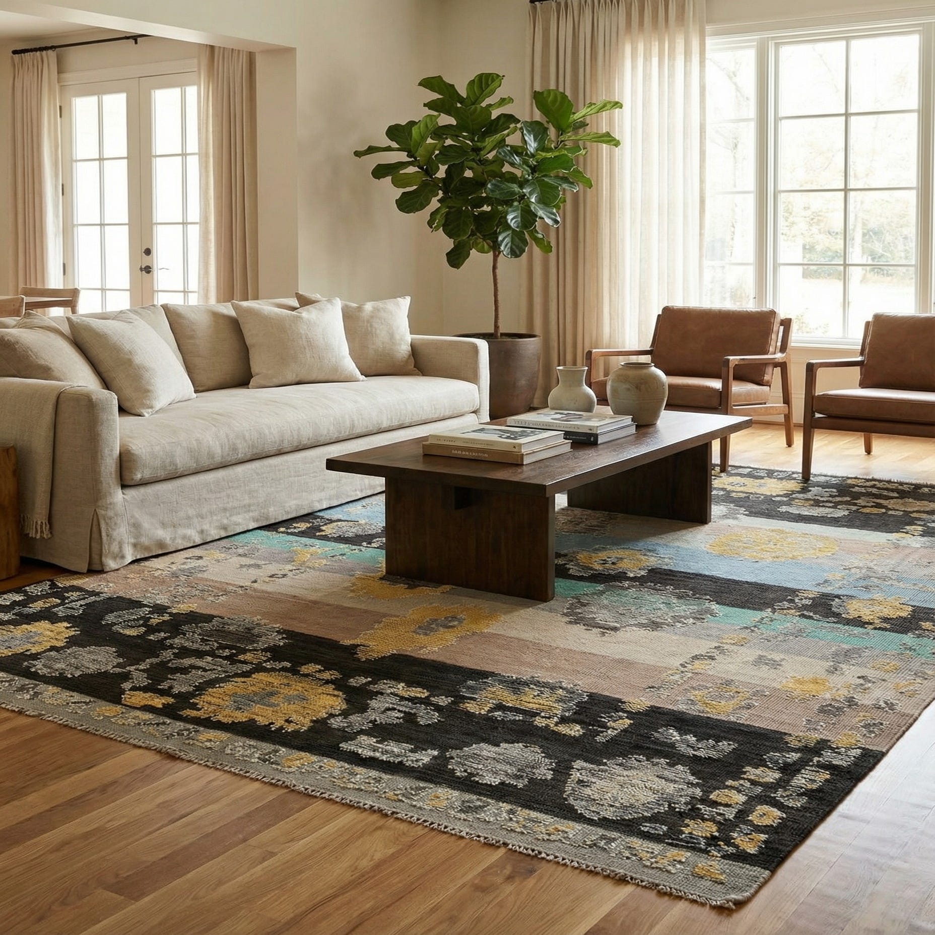 Primary color is Multi. Colors in this rug include: Multi, Black, Gray, Green, Ivory, Yellow, Light Brown.