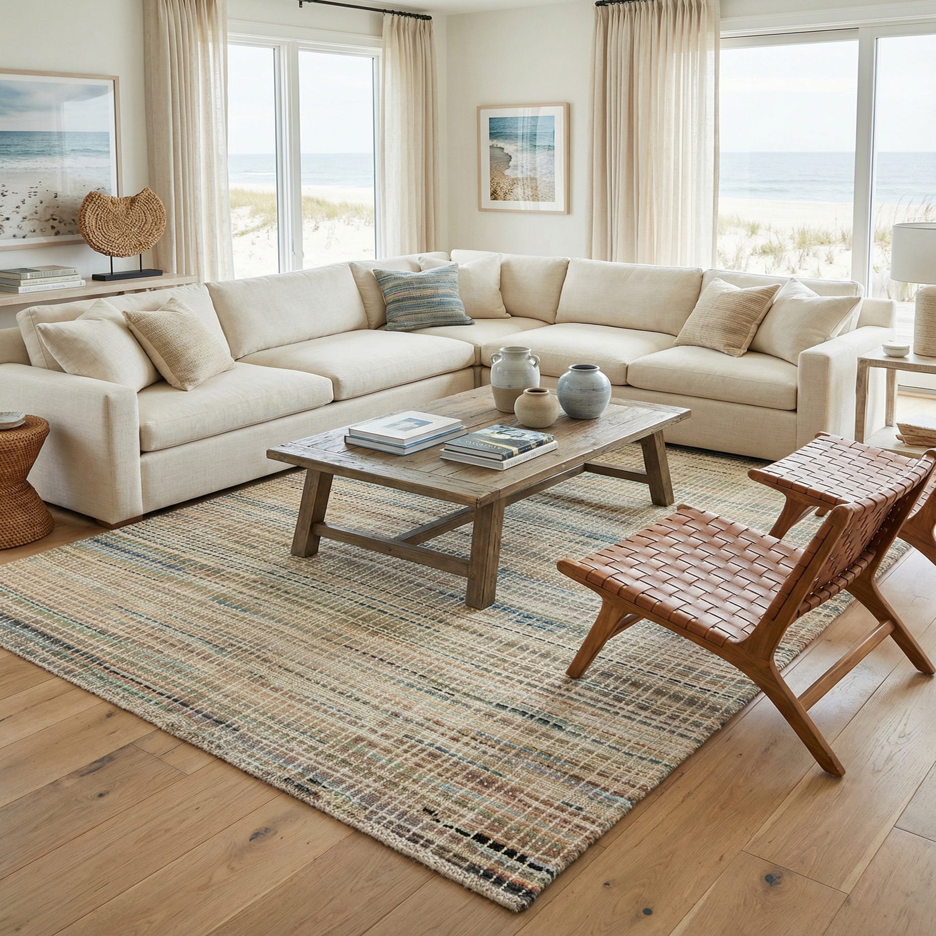 Primary color is Multi. Colors in this rug include: Multi, Brown, Black, Blue, Light Blue, Light Brown, Cream.