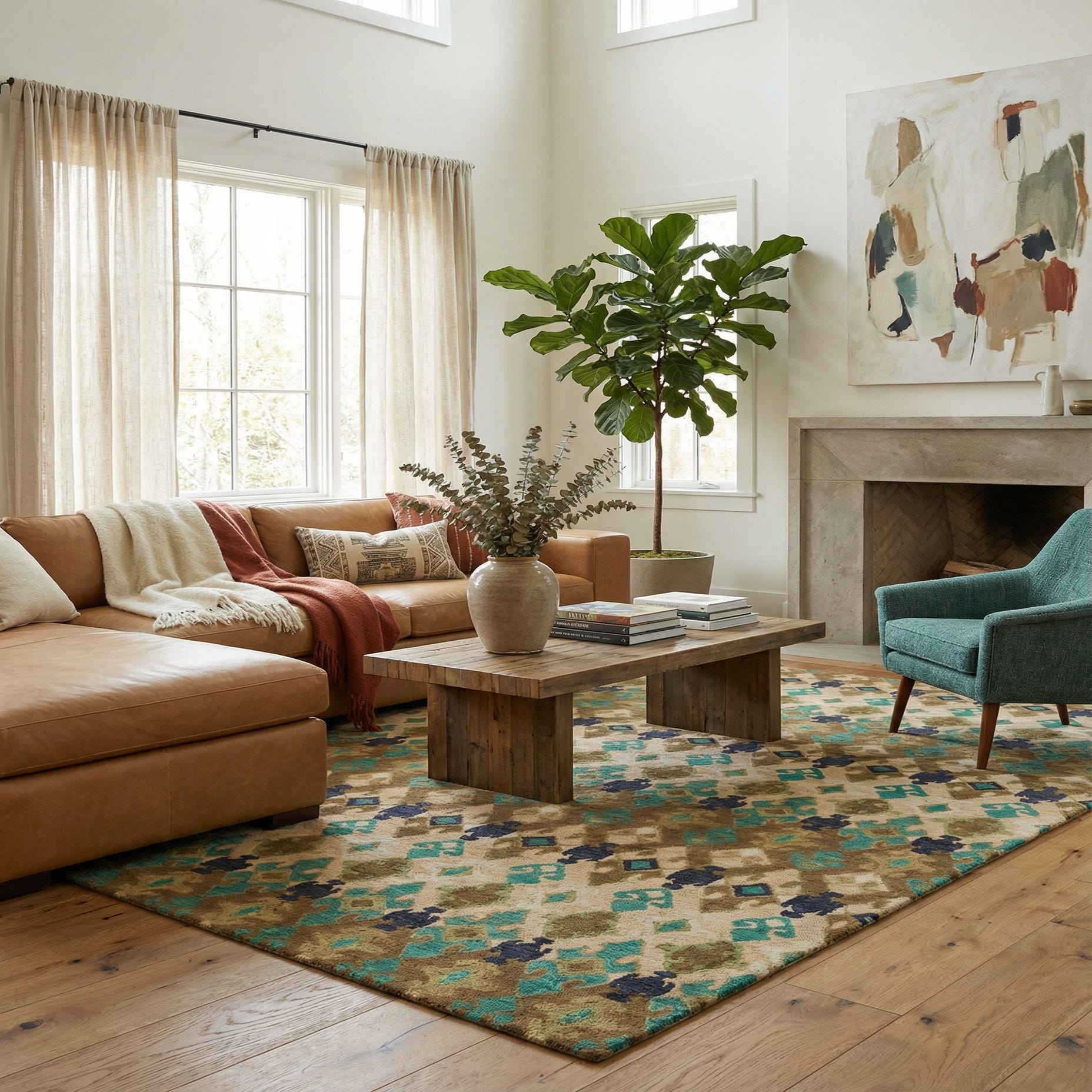 Primary color is Multi. Colors in this rug include: Multi, Beige, Brown, Navy Blue, Green, Ivory, Olive.