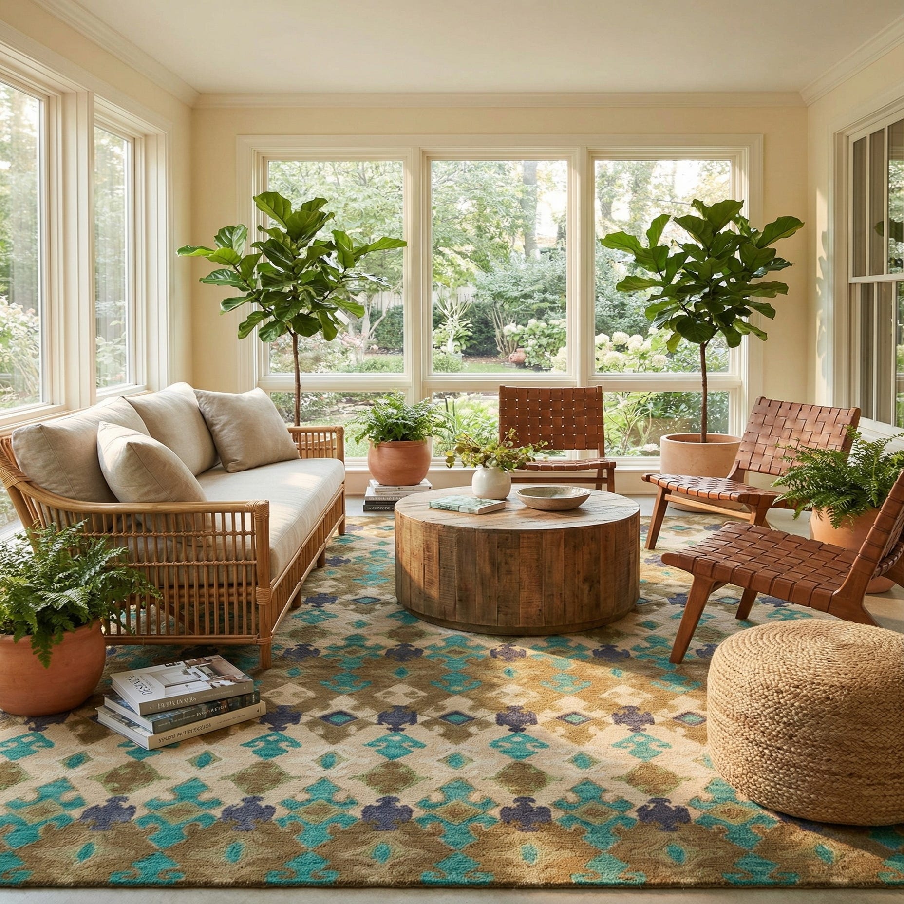 Primary color is Multi. Colors in this rug include: Multi, Beige, Navy Blue, Tan, Teal, Brown, Ivory.
