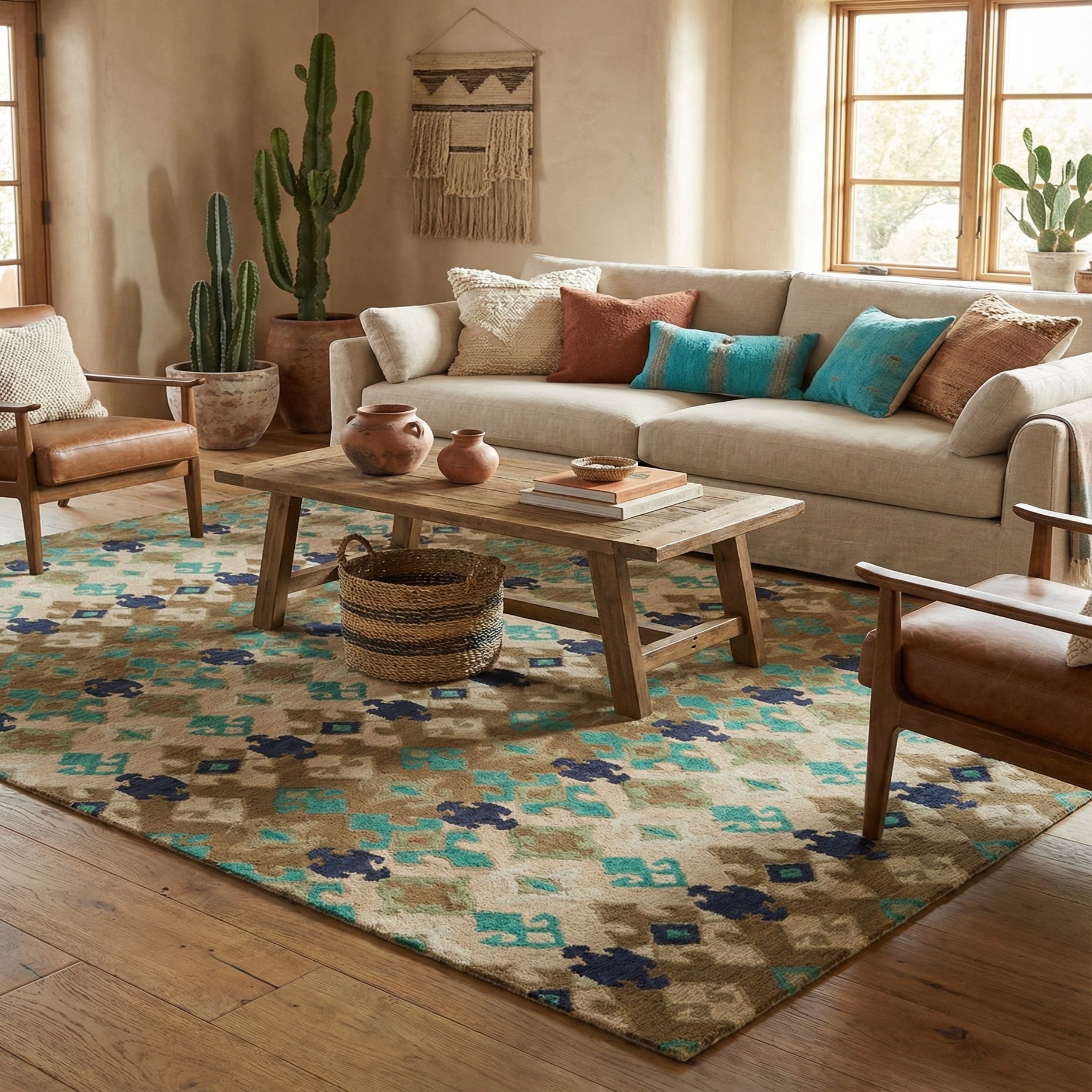 Primary color is Multi. Colors in this rug include: Multi, Beige, Ivory, Navy Blue, Olive, Tan, Turquoise, Green.