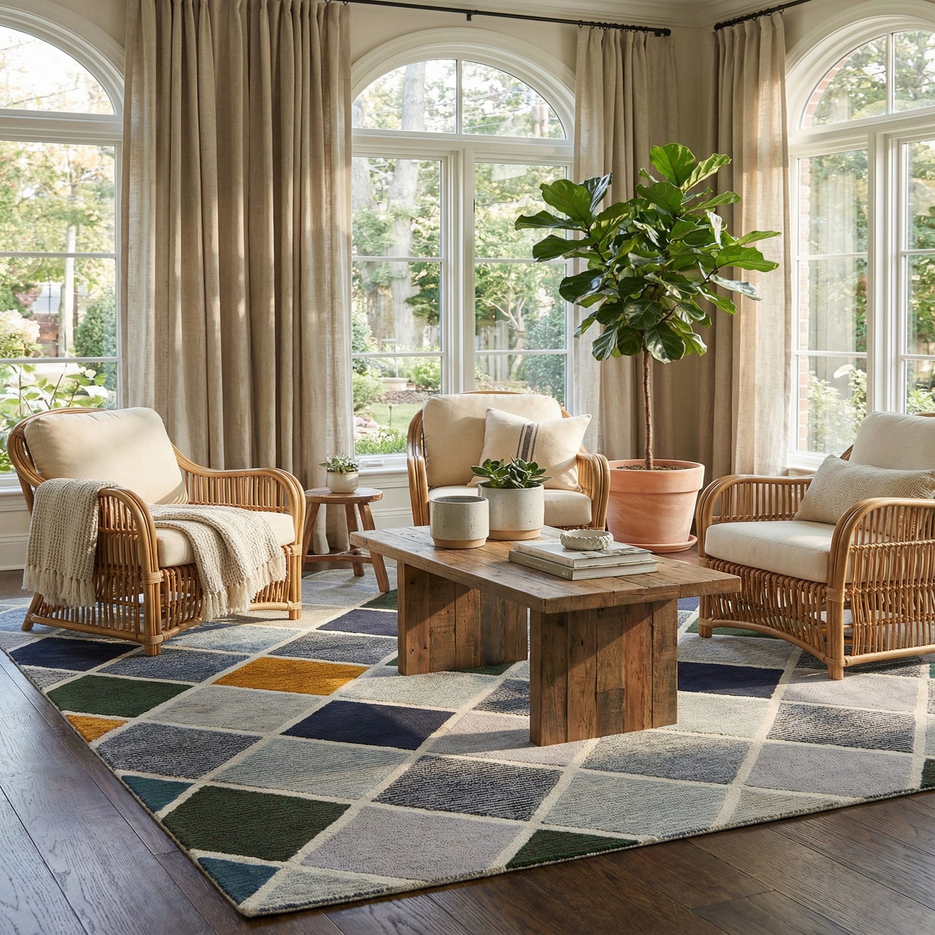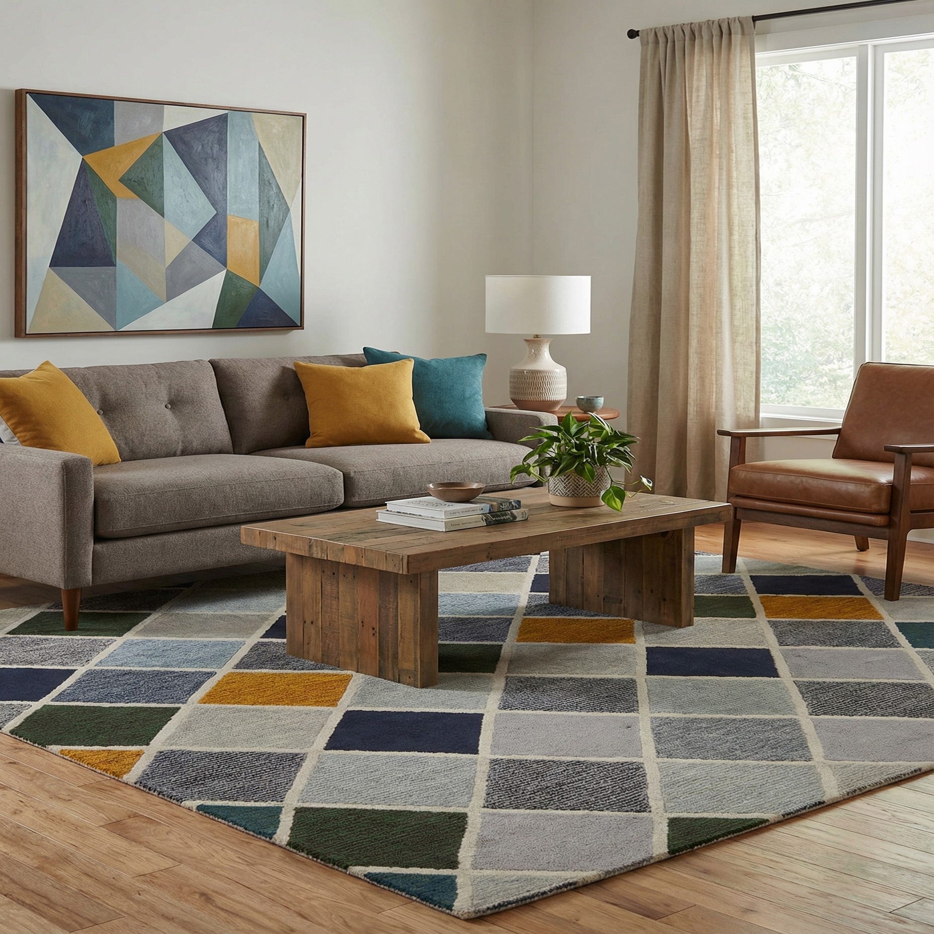 Primary color is Multi. Colors in this rug include: Multi, Black, Blue, Gray, Hunter Green, Ivory, Navy Blue, Rust Red, Yellow, Light Blue.