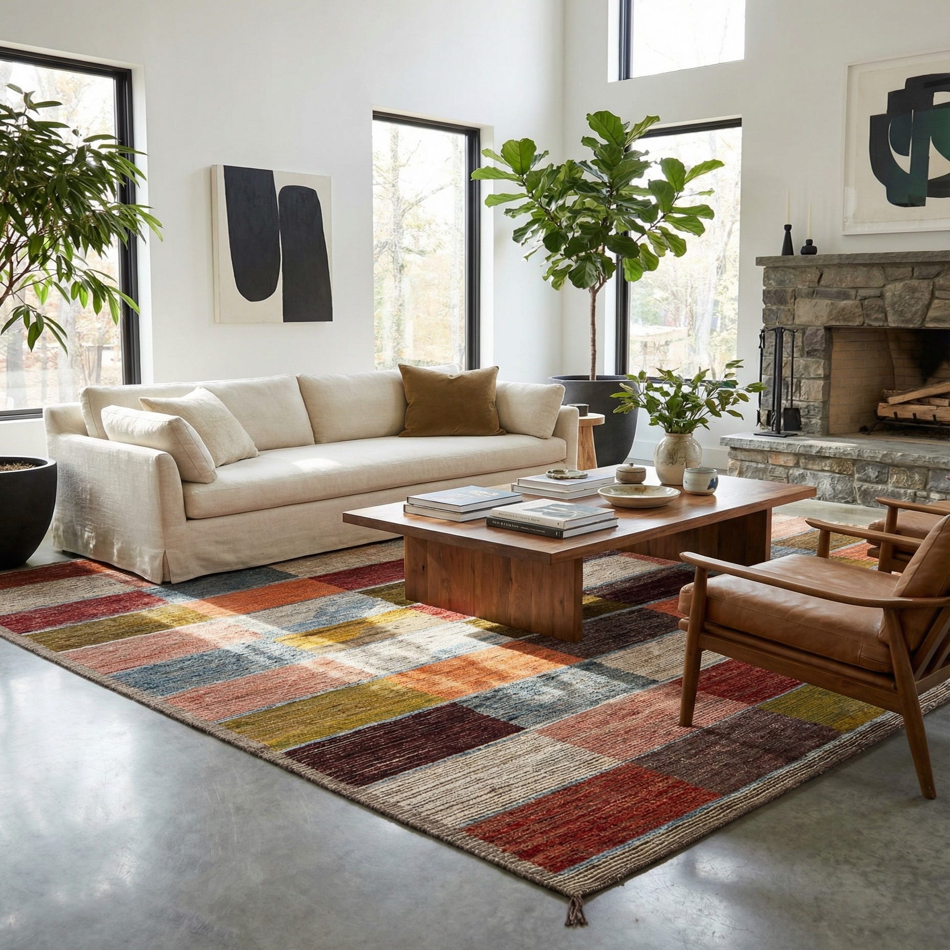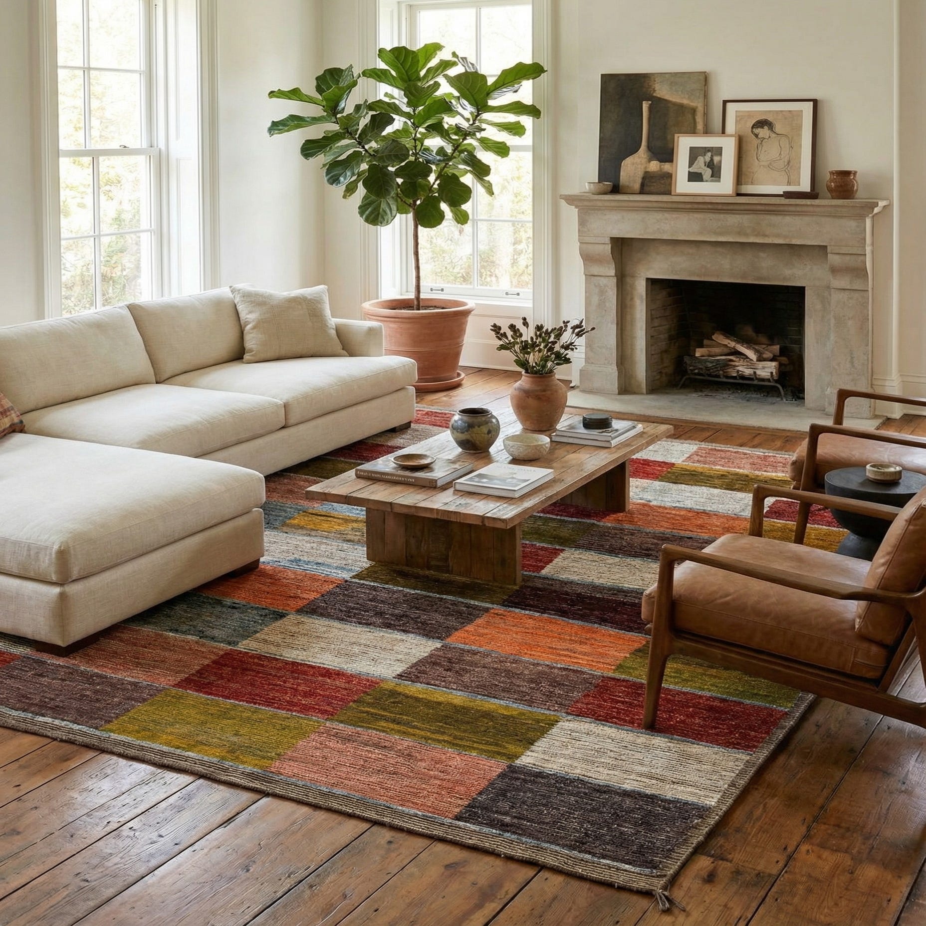 Primary color is Multi. Colors in this rug include: Multi, Blue, Brown, Green, Orange, Red, Yellow, Ivory.