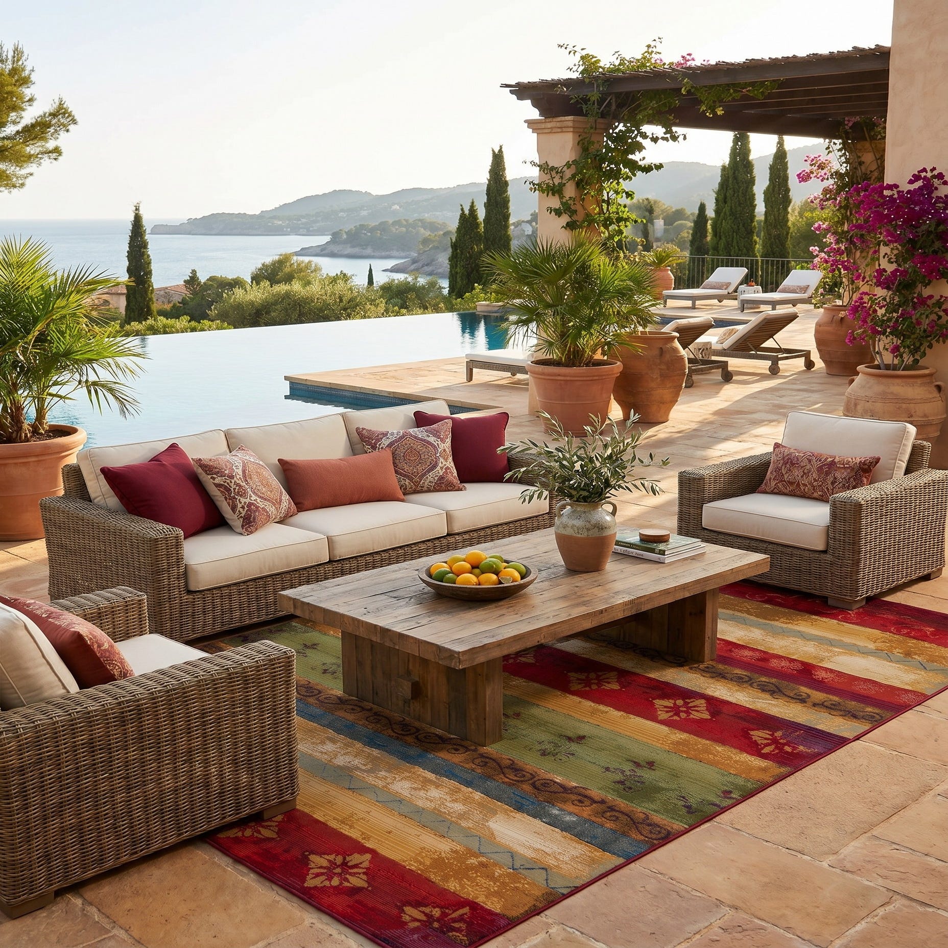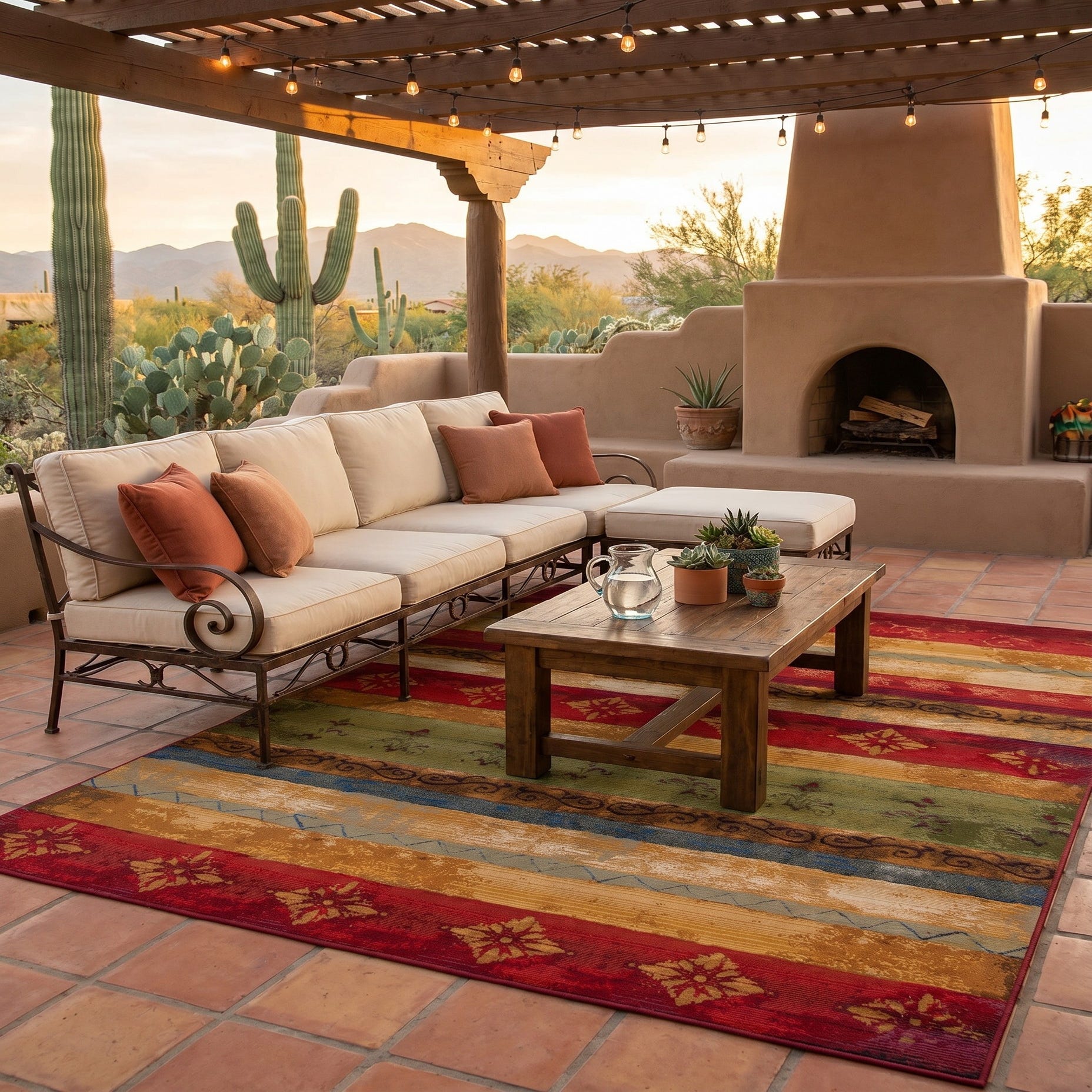Fell in love with this rug when I saw it on-line for its delightful pattern and vivid colors. It arrived in two days from the day ordered about a week ago. We put it down on our renovated deck today...it is even more awesome than we thought it would be! The colors and pattern outset the colors of the deck perfectly.