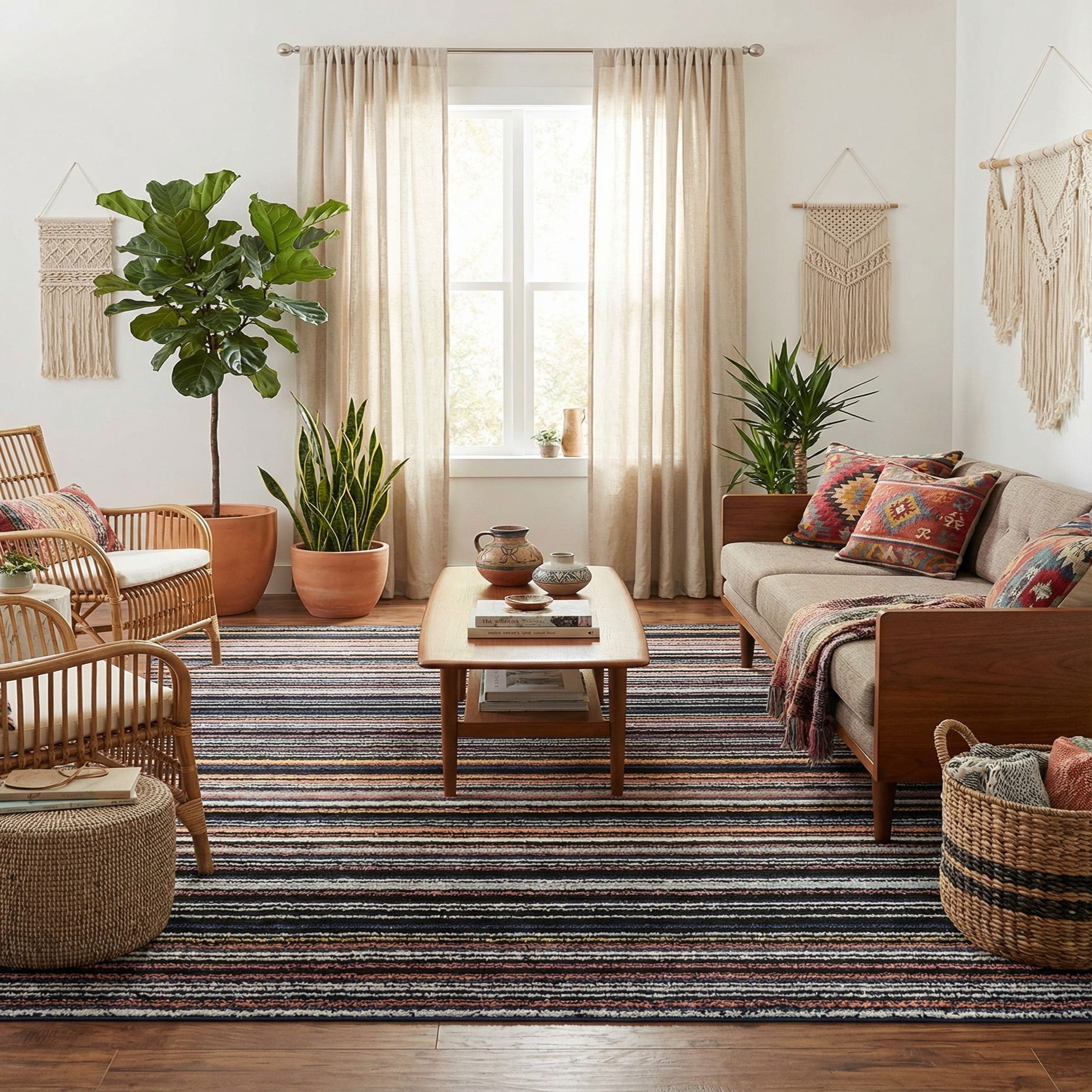 Primary color is Multi. Colors in this rug include: Multi, Black, Blue, Ivory, Light Blue, Peach, Yellow, Pink, Navy Blue.