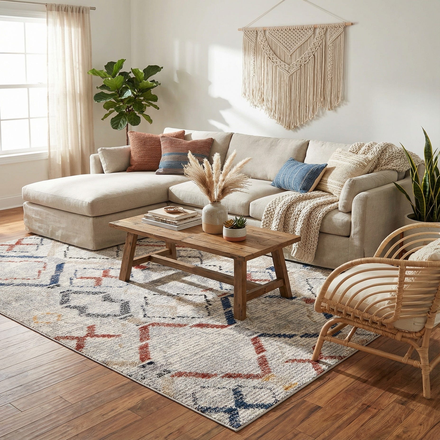 Primary color is Multi. Colors in this rug include: Multi, Black, Gray, Ivory, Rust Red, Yellow, Beige.