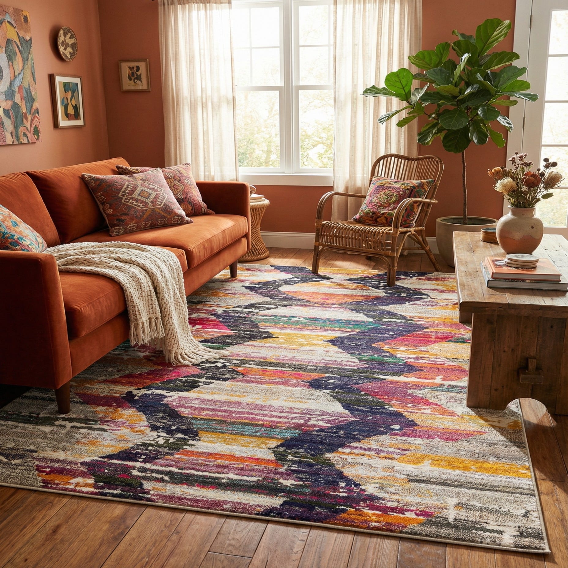 Primary color is Multi. Colors in this rug include: Multi, Beige, Black, Blue, Brown, Gray, Green, Ivory, Orange, Yellow, Pink, Purple.