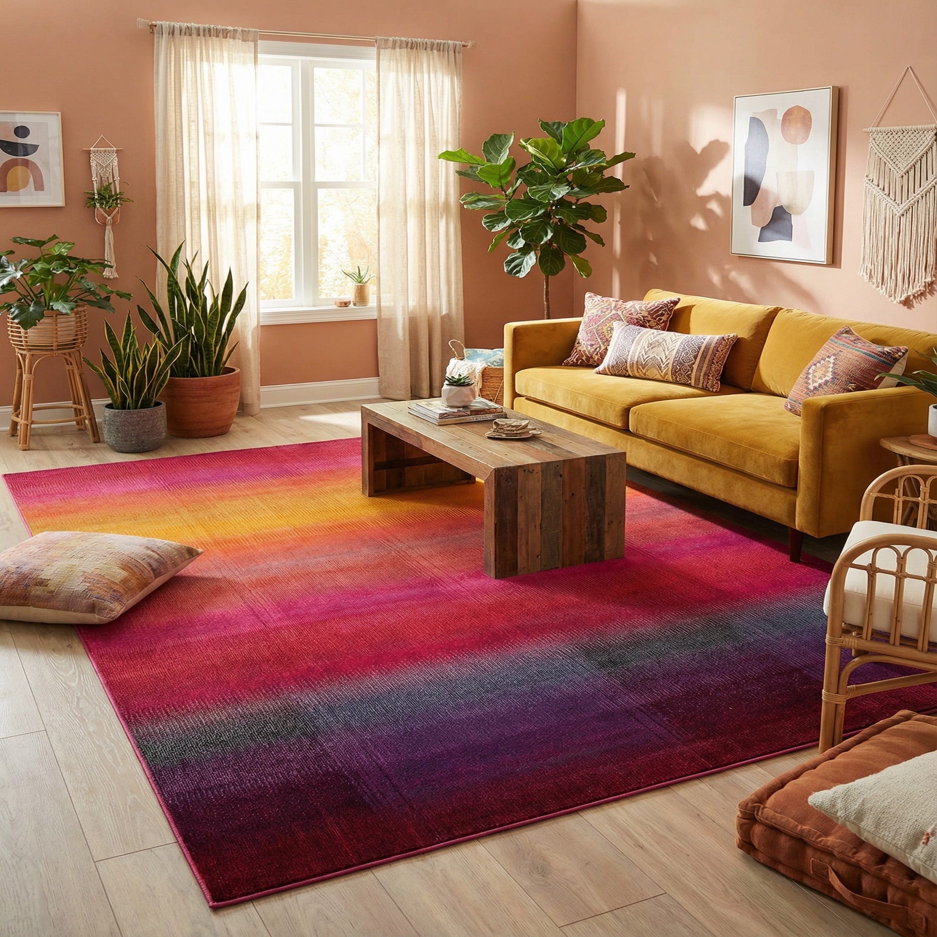 Primary color is Multi. Colors in this rug include: Multi, Gold, Orange, Purple, Yellow, Violet, Pink, Peach, Beige.