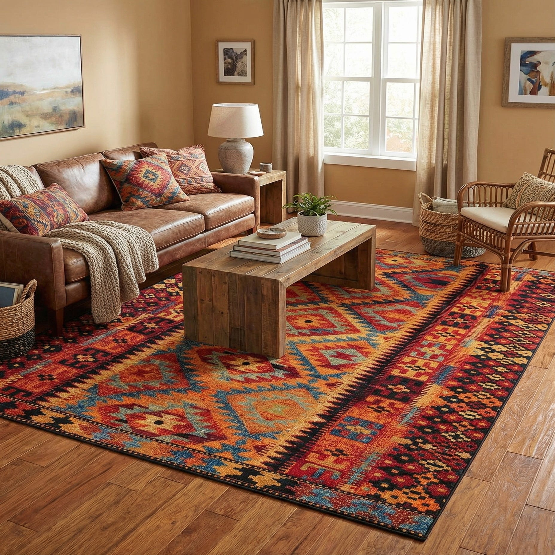 Primary color is Multi. Colors in this rug include: Multi, Blue, Navy Blue, Olive, Red, Rust Red, Tan, Terracotta, Light Blue, Light Brown, Peach.