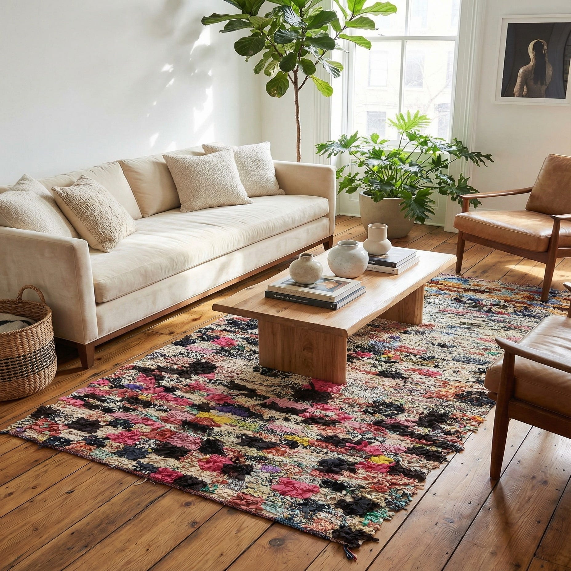 Primary color is Multi. Colors in this rug include: Multi, Blue, Brown, Ivory, Orange, Yellow, Black, Pink, Purple, Red, Peach.