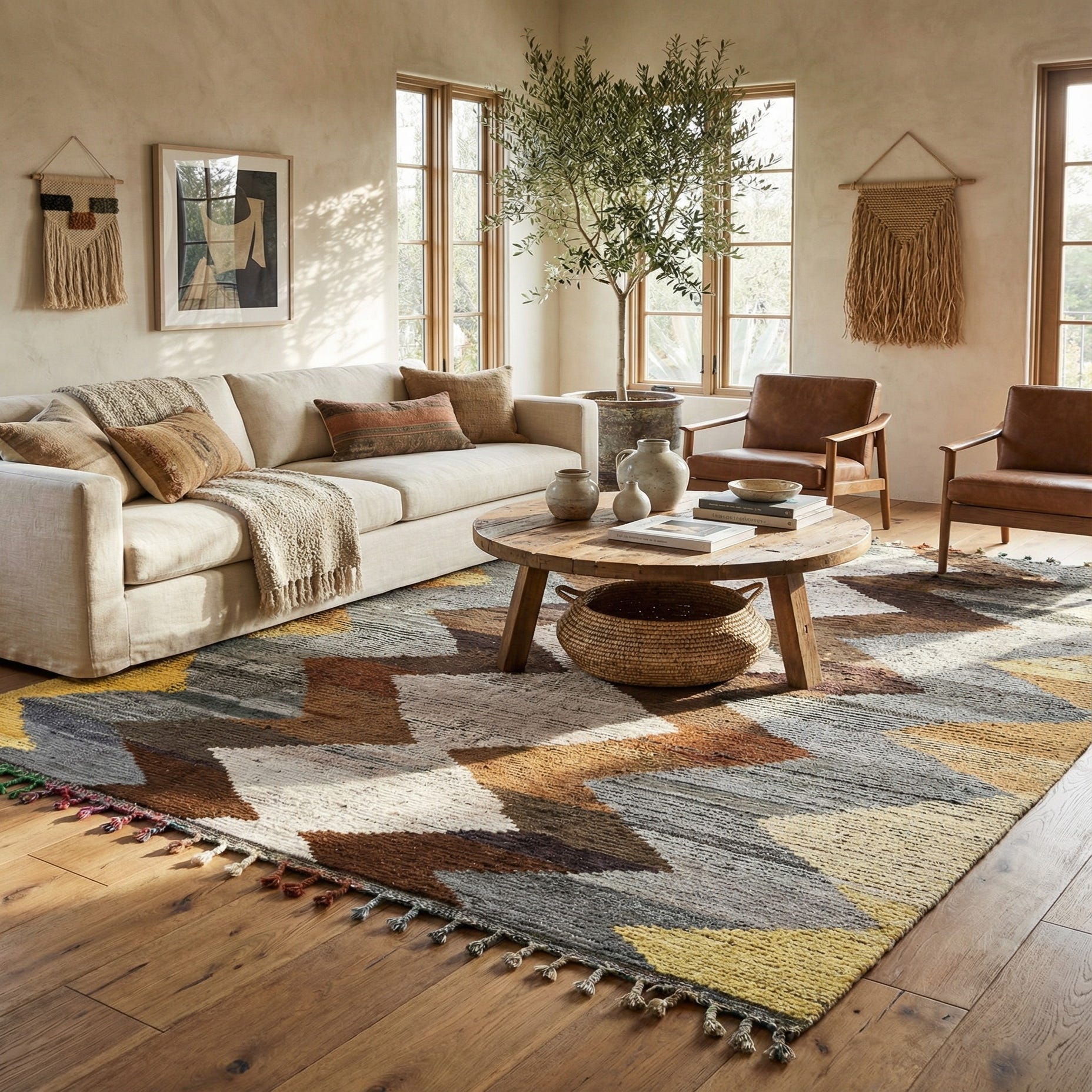 Primary color is Multi. Colors in this rug include: Multi, Beige, Brown, Gray, Ivory, Black, Yellow.