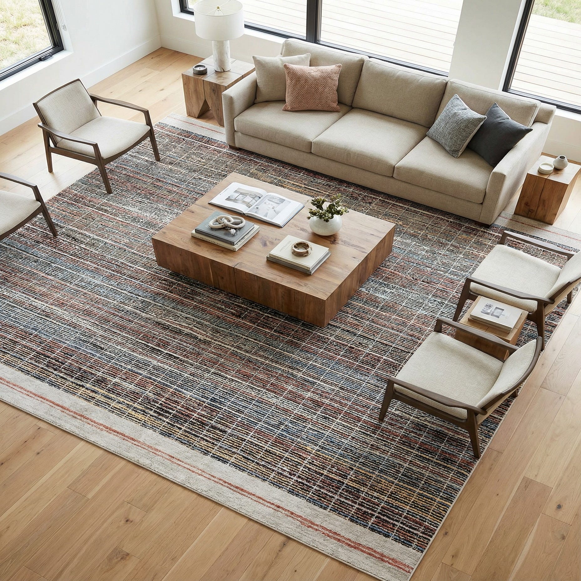 Primary color is Multi. Colors in this rug include: Multi, Beige, Black, Ivory, Light Blue, Light Brown, Rust Red.