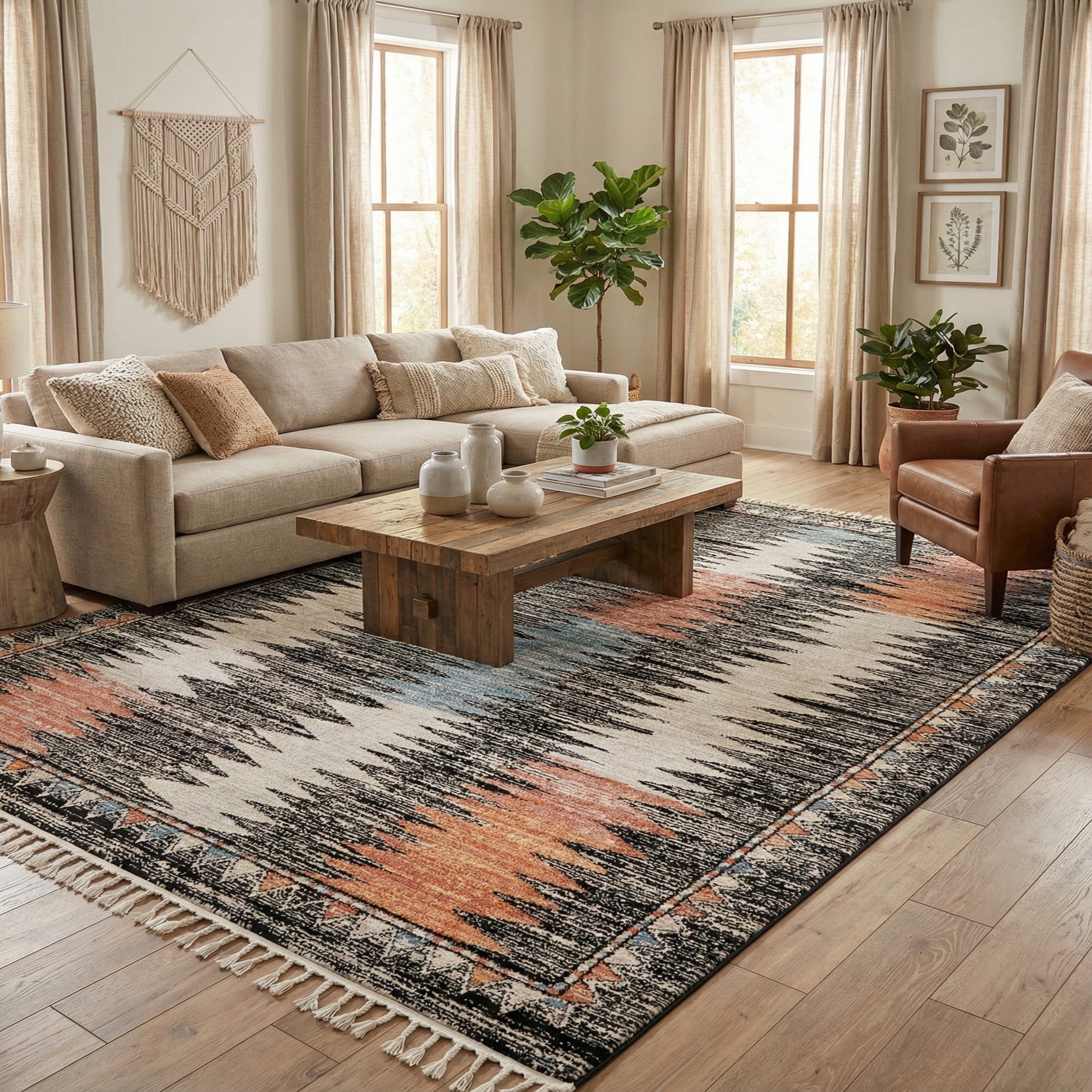 Primary color is Multi. Colors in this rug include: Multi, Black, Ivory, Light Blue, Terracotta, Orange.