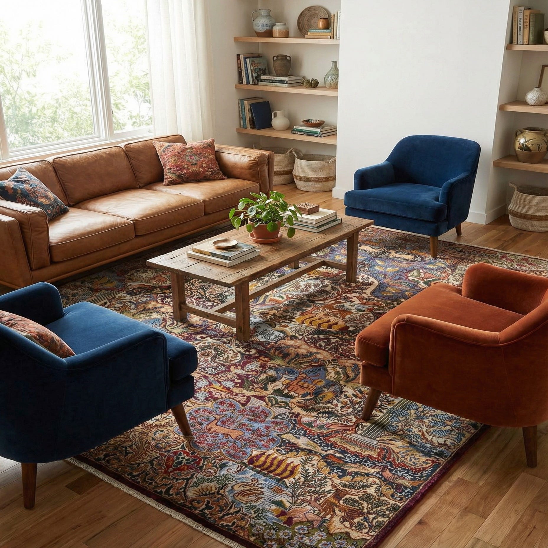 Primary color is Multi. Colors in this rug include: Multi, Beige, Black, Blue, Brown, Ivory, Olive, Orange, Purple, Yellow.
