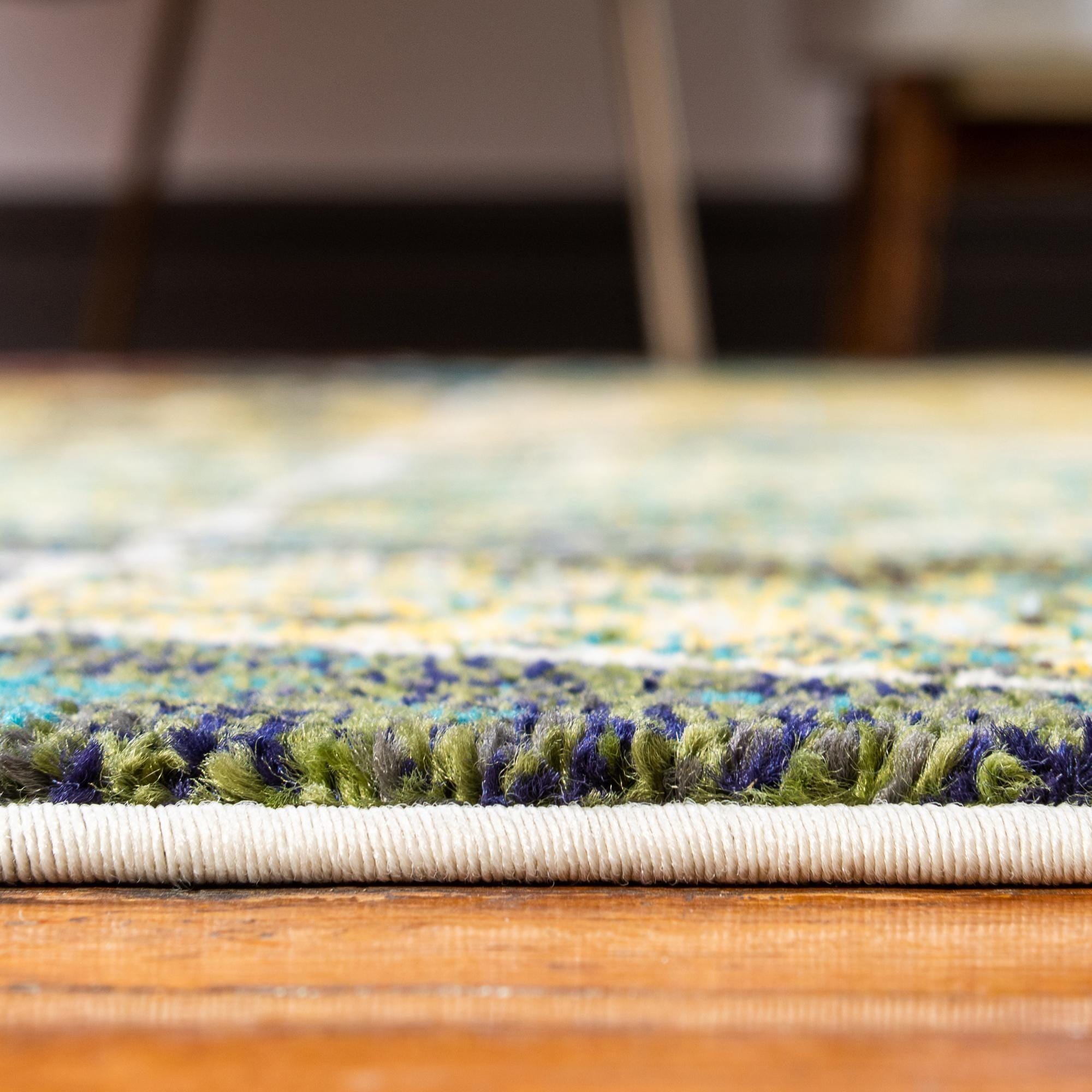 Primary color is Multi. Colors in this rug include: Multi, Blue, Brown, Green, Peach, Beige, Yellow.