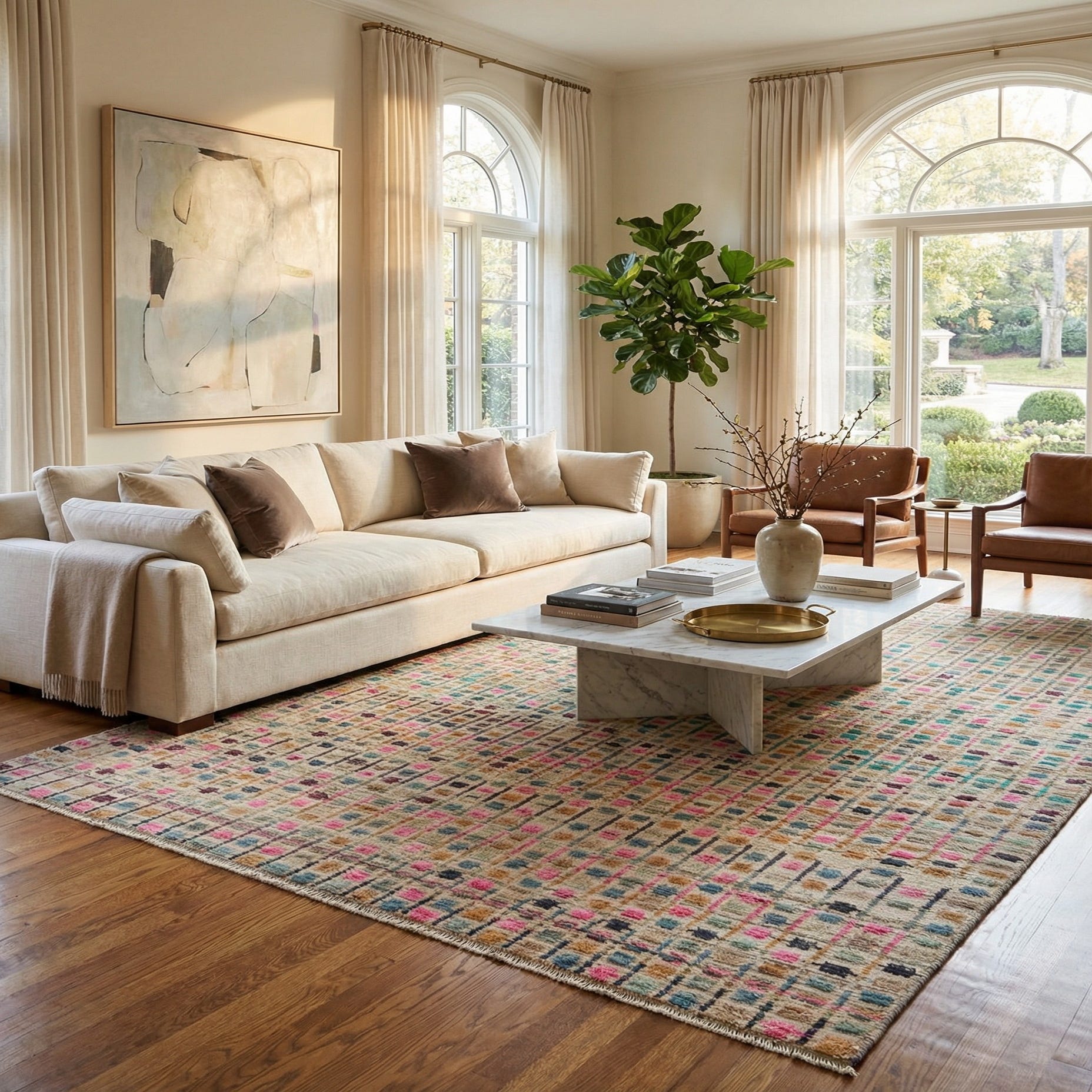 Primary color is Multi. Colors in this rug include: Multi, Beige, Black, Blue, Brown, Burgundy, Gray, Green, Olive, Orange, Purple, Red, Turquoise, Yellow, Violet, Pink, Ivory, Light Blue, Light Brown, Light Green.